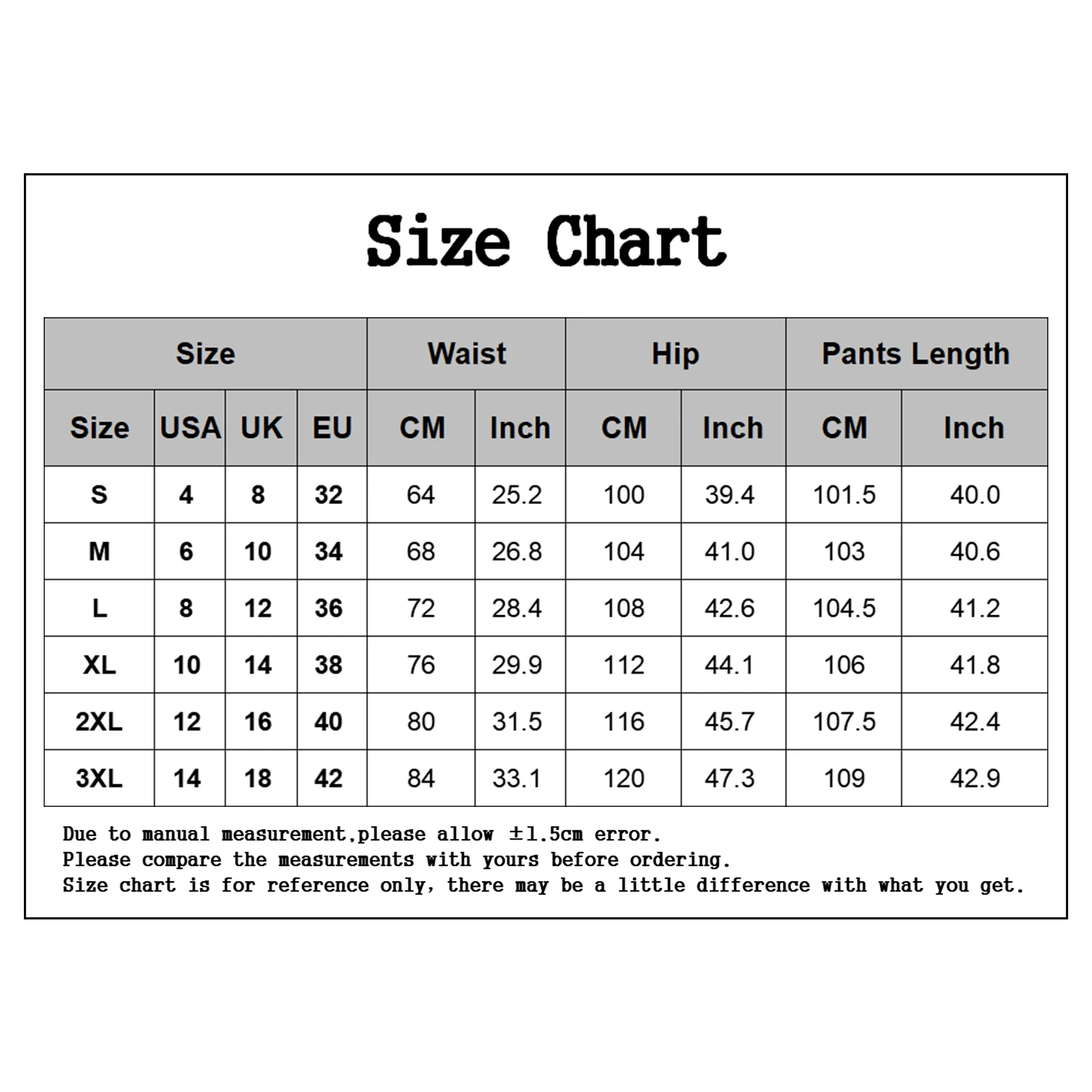 Эластичный пояс не затягивает живот. Длинные широкие брюки делают вас стройнее.Вы можете сочетать эти однотонные брюки с вашей любимой рубашкой, футболкой или блузкой для стильного образа жизни.Эти брюки изготовлены из трикотажной ткани, которую удобно носить.Есть шесть размеров (S, M, L, XL, 2XL, 3XL), и вы можете выбрать тот, который вам подходит.Подходит для отдыха, прогулок, семейных встреч, свиданий, вечерние, работы, шопинга, повседневной носки. Вы можете носить его четыре сезона, особенно весной, летом и осенью.Наименование товара: брюкиМатериал: трикотажная тканьСтиль: ПовседневныйПол: Для женщинТип размера: ОбычныйУход За Одеждой: ручная стиркаИнформация о размере:[Наш Размер S] обхват талии: 64 см/25,2 ", обхват бедер: 100 см/39,4", Длина: 101,5 см/40 "(прибл.)[Наш Размер M] обхват талии: 68 см/26,8 дюйма, обхват бедер: 104 см/40,9 дюйма, длина: 103 см/40,6 дюйма (прибл.)[Наш Размер L] обхват талии: 72 см/28,3 дюйма, обхват бедер: 108 см/42,5 дюйма, длина: 104,5 см/41,1 дюйма (прибл.)[Наш Размер XL] обхват талии: 76 см/29,9 дюйма, обхват бедер: 112 см/44,1 дюйма, длина: 106 см/41,7 дюйма (прибл.)[Наш Размер 2XL] обхват талии: 80 см/31,5 дюйма, обхват бедер: 116 см/45,7 дюйма, длина: 107,5 см/42,3 дюйма (прибл.)[Наш Размер 3XL] обхват талии: 84 см/33,1 дюйма, обхват бедер: 120 см/47,2 дюйма, длина: 109 см/42,9 дюйма (приблизительно)Примечания:Пожалуйста, обратитесь к нашей таблице размеров и выберите правильный размер.Благодаря светильник и экрана Цвет Товара может быть s светильник ly отличается из-за характеристик монитора компьютера.Посылка включает в себя:Брюки-1 шт.