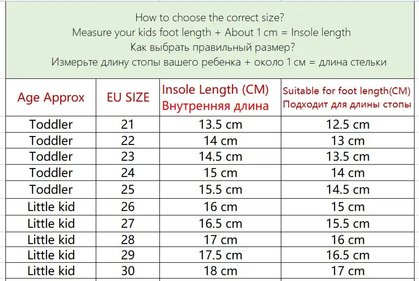 Поскольку все размеры детской обуви отличаются, при заказе детской обуви вы должны соответствовать нашим размерам и внутренней длине.