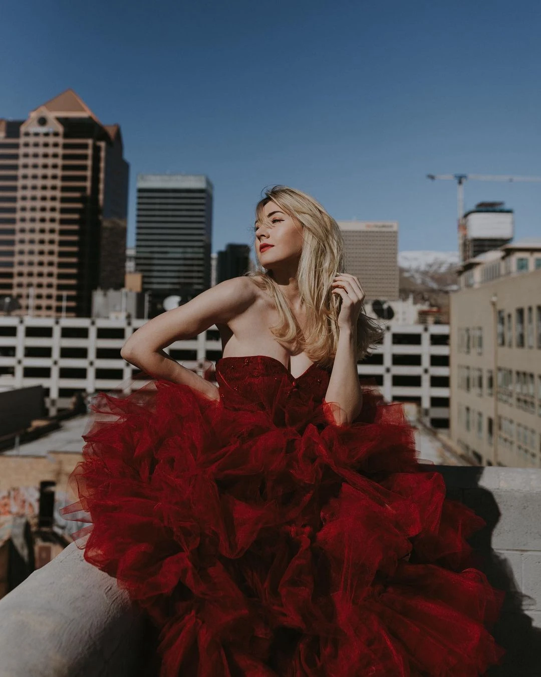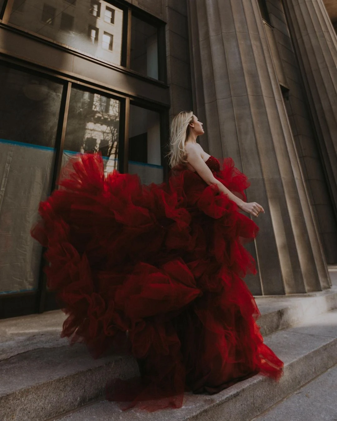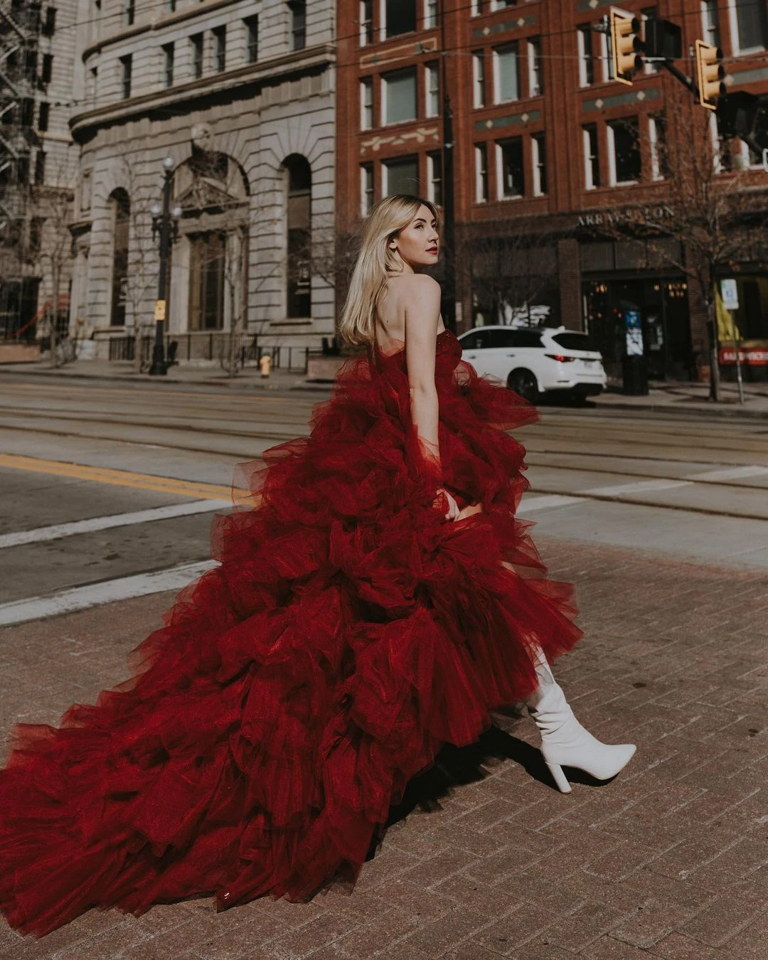 Платье длинное бордовое пушистое без бретелек со шлейфом