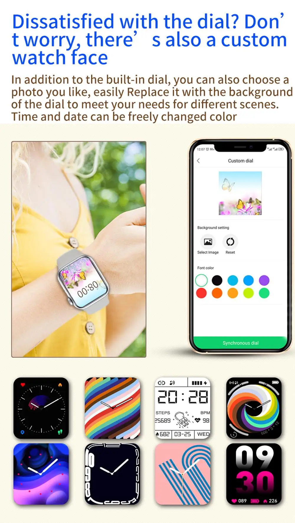 Поддержка 1,69 дюймового полного сенсорного экрана, Bluetooth вызова, пульса, кровяного давления, кислорода в крови, Мути-спортивные режимы, обмен 44 мм ремешок, bluetooth музыка, может таможня часы лица, погода, сплит-экран, кнопка поворота, 3 UI.
