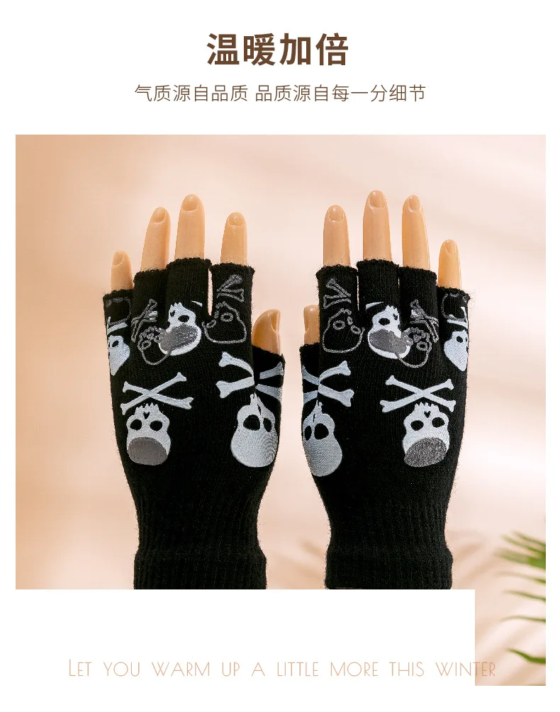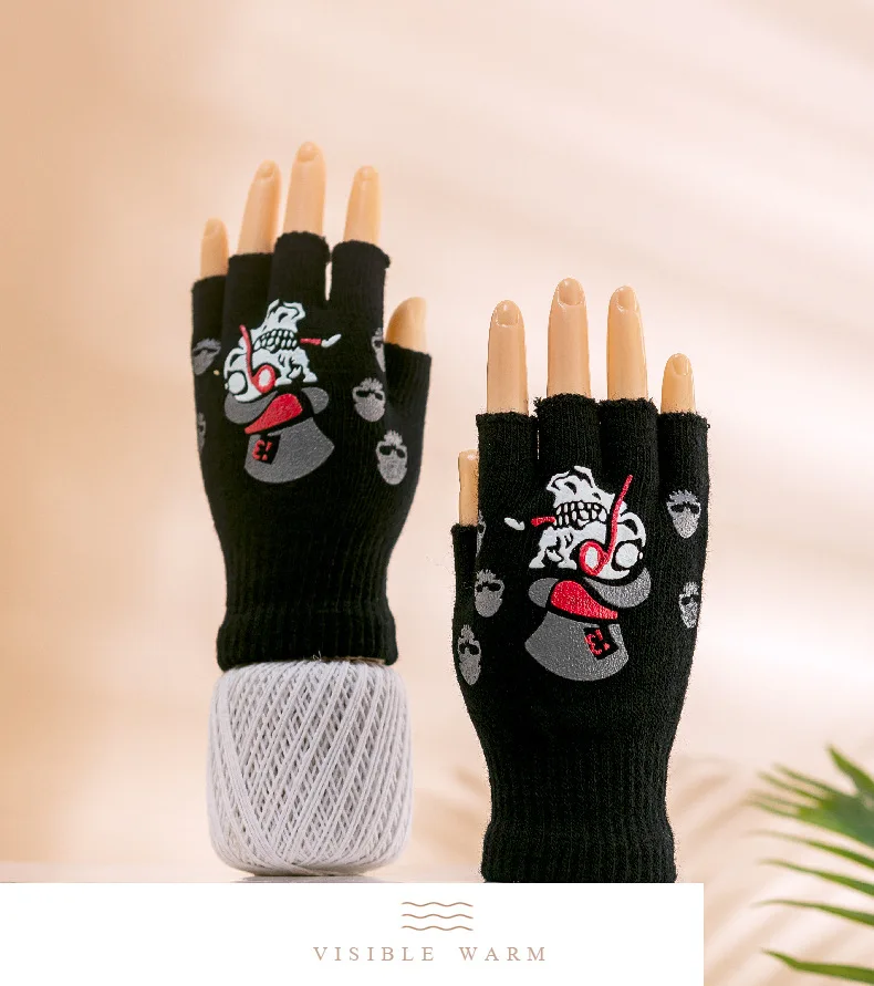 Перчатки на полпальца для взрослых, теплые вязаные, с принтом скеле...