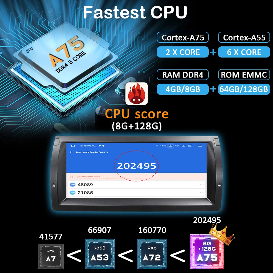Самый быстрый процессорСамый быстрый процессор на современном рынке.Лучше, чем PX5 PX6 7862 9853 или другие ЦПAntutu Score- 202495, это самый высокий балл во всех ЦП в настоящее время