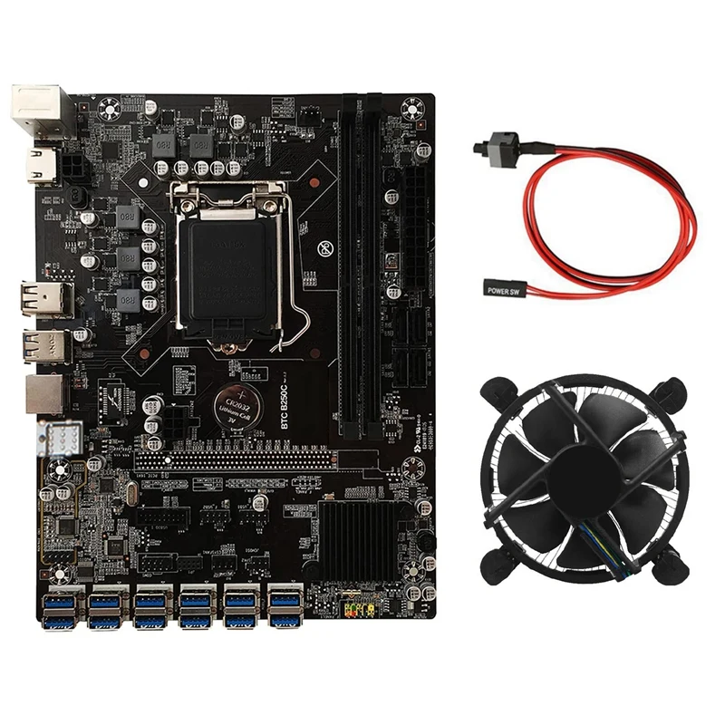Материнская плата B250C для майнинга BTC с кулером охлаждения ЦП + кабель переключения 12XPCIE на USB3.0 слот GPU LGA1151 поддерживает DDR4 DIMM RAM