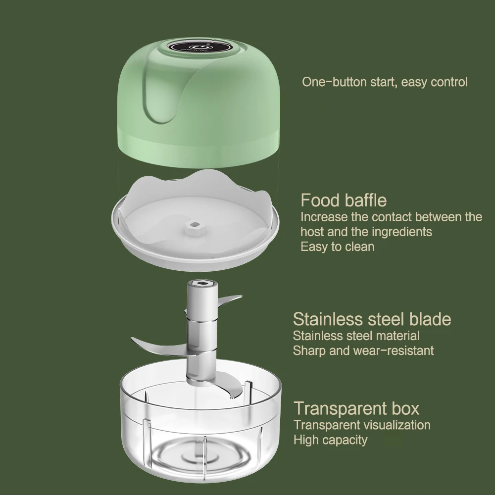 # Параметры★Основной продукт: мини Электрический чеснок Чоп★Материал: лезвие из нержавеющей стали/пластиковый корпус★Емкость: 100 / 250 мл★СпециальныйSave. Экономит время и энергиюⅡ. Прочный, прочный и легко чиститсяⅢ. С острым лезвием# Включая упаковкуВарианты:1 (100 или 250 мл) Электрический измельчитель чеснока1 USB кабельКомплект:1 100 мл Электрический измельчитель чеснока