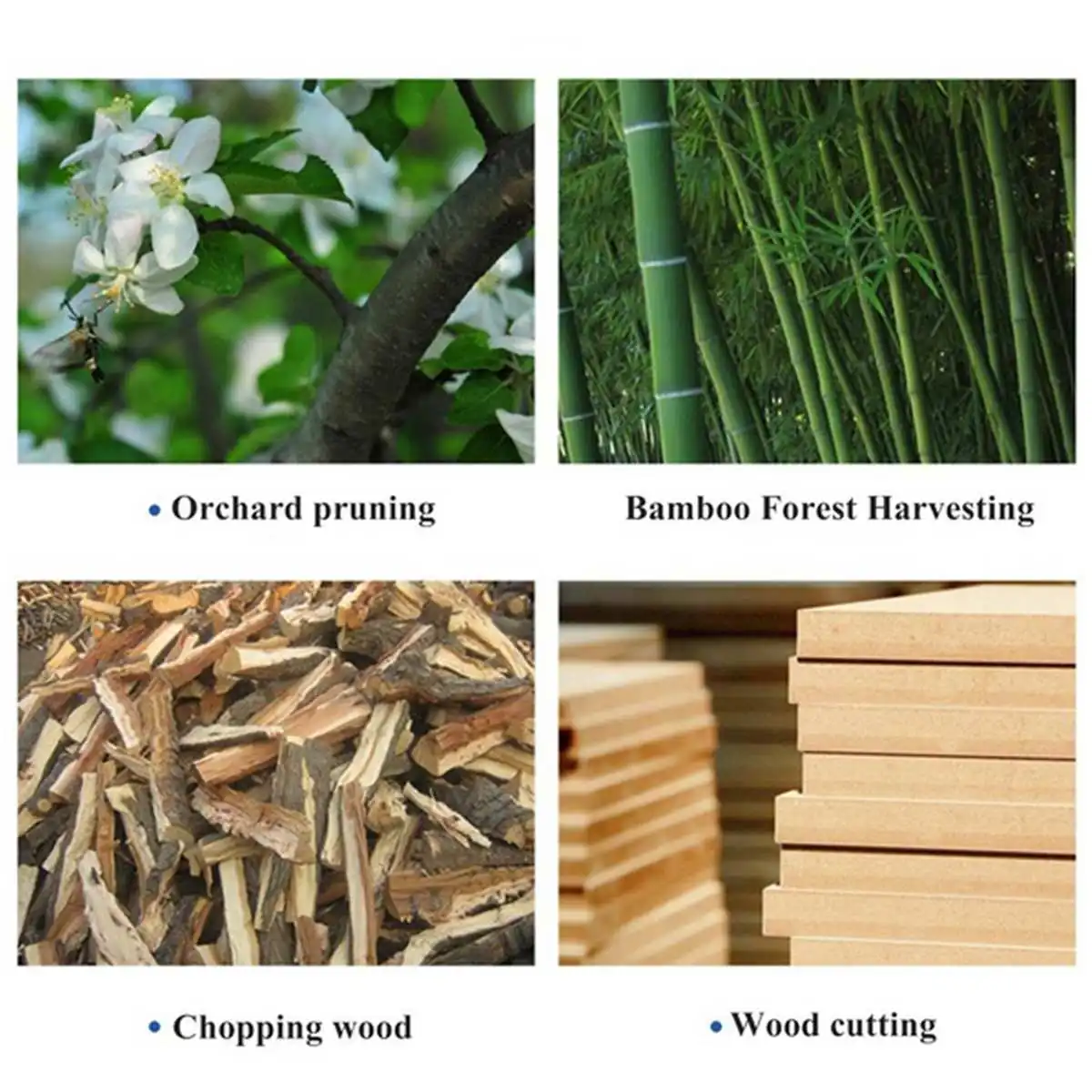 Характеристика:-Эргономичная ручка, которая очень удобна и безопасна для переноски.-Ручка имеет противоскользящий дизайн, который очень удобен для захвата.-Безопасность пилы, эффективно повышает эффективность вашей работы.-Бесступенчатая скорость, более детальная обрезка, лучшая защита деревьев.-Цепи пилы закаливают, закаляют и отжигают. Они долговечны, чем обычные цепи пилы.