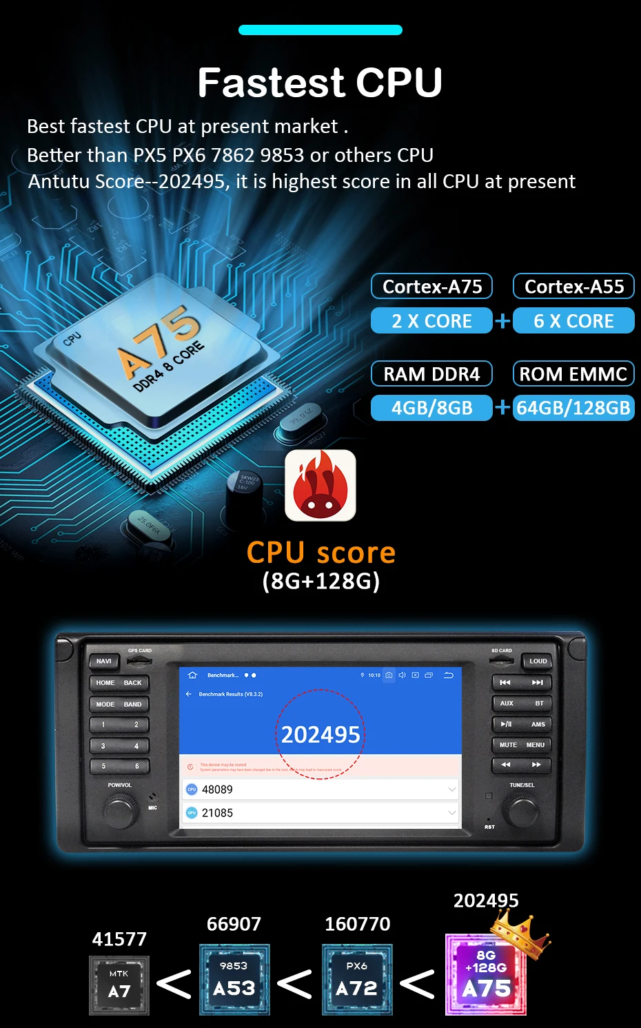 Самый быстрый процессорСамый быстрый процессор на современном рынке.Лучше, чем PX5 PX6 7862 9853 или другие ЦПAntutu Score- 202495, это самый высокий балл во всех ЦП в настоящее время