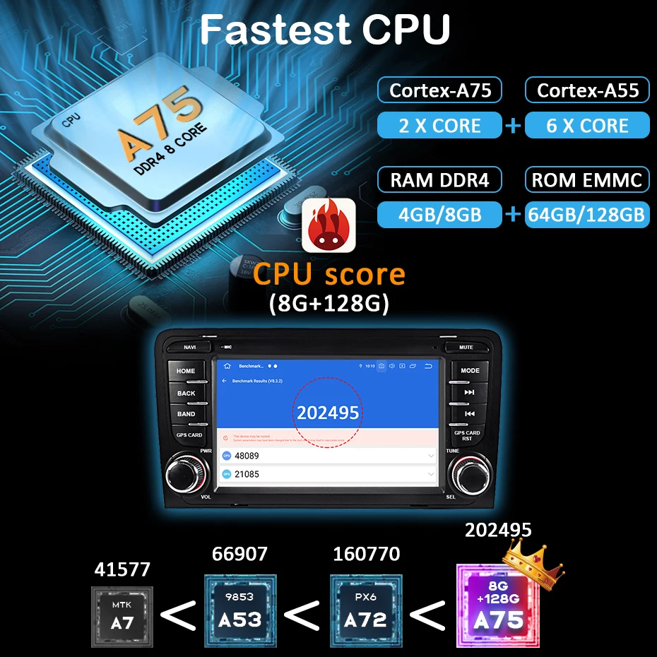 Самый быстрый процессорСамый быстрый процессор на современном рынке.Лучше, чем PX5 PX6 7862 9853 или другие ЦПAntutu Score- 202495, это самый высокий балл во всех ЦП в настоящее время