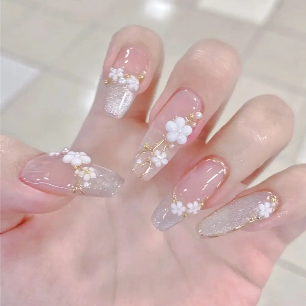 3D белые цветы, прозрачный дизайн из фольги, накладные ногти, накладные ногти для женщин невесты, искусственные ногти, полное покрытие, маленькие свежие накладные ногти