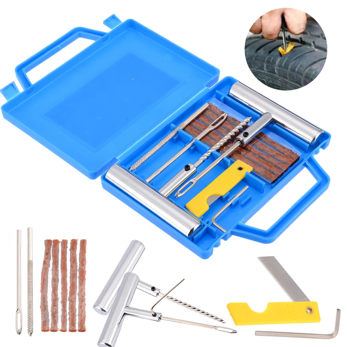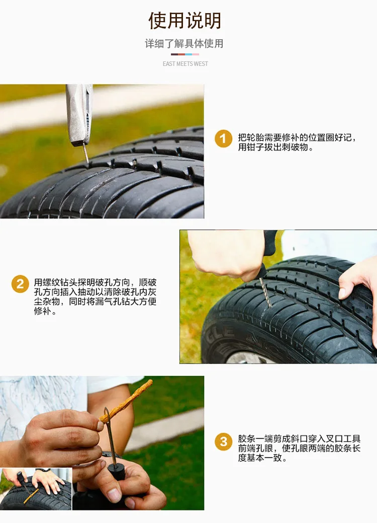 Роскошный бескамерный комплект для ремонта шин, универсальный прокол, пластиковый чехол, упаковка для автомобиля, 11 шт.11 шт. комплект для ремонта автомобильных шинМатериал: металл/пластик/ДругоеИнструкция:В чехол утечки воздуха, пожалуйста, подтвердите, в котором будут следующие пункты:1. Отметьте проколованную часть шины и вытяните проколот.2. Используйте датчик для ремонта шин, чтобы узнать направление проникновения отверстия, и вставьте всасывание в направлении отверстия, чтобы удалить пыль и загрязнения в отверстии.3. Нарежьте один конец резиновой ленты на косой вырез и проденьте ее в ушко на переднем конце вставки штифтаИнструмент, так что длина резиновой ленты на обоих концах ушей в основном одинаковая.4. Вставьте булавки с резиновой прокладки в шин по отверстия, чтобы гарантировать, что резиновая полоска вставлена 2 / 3 длины(Необходимо определить холодный ремонт) Резиновая лента проникает в тушку, чтобы избежать выскальзывания после надувания) и поворачивает штырь на 360 градусов, чтобы вытянуть штырь.5. Для остальных резиновых полосок для ремонта шин за пределами шины, оставьте длину 5 мм на протекторе и отрежьте остальные.Меры предосторожности:1. Направление разрыва отверстия должно быть обнаружено с помощью зонда, чтобы гарантировать направление вставки и положение клеяПолоса соответствует направлению проникновения отверстия для ногтей в противном случае произойдет утечка воздуха. Например, уголМежду направлением перфорации и протектором наклоняется на 50 градусов, а зонд и штифт вставляются на входеТакже работает вдоль этого склона.2. После подтверждения того, что Резиновая полоса достаточно, чтобы проникнуть в шину, поверните инструмент шпильки для одного круга (360 градусов)И вытяните его, чтобы убедиться, что Резиновая лента сдавливает прокол и образует вращающийся узел в шине, чтобы избежать воздухаУтечка.3. Чехол с глубоким наклонным отверстием, длина резиновой ленты должна быть обеспечена, чтобы Резиновая лентаПроникайте в шину