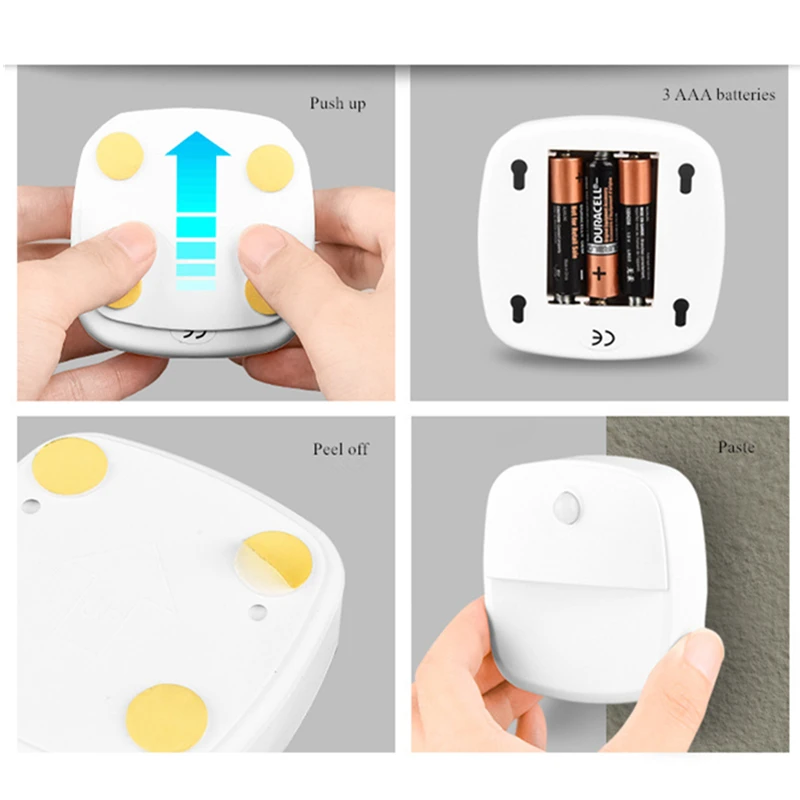 Светильник источник света: светодиодный Светодиодный Количество: 1 шт. светильник Цвет: теплый светильник/белый светильник Цвет температура: 4000K-5000K Мощность: 0,5 Вт Световой поток: 10-11LM Напряжение: 4,5 V Мощность ed: 3 * AAA батареи (не прилагаются) Расстояние обнаружения: 3 м/9.84ft Угол обнаружения: 120 градусов Материал: АБС-пластик + Поликарбонат Размеры: 75*75*27 мм/2,9*2,9 * 1.1in