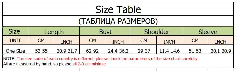 Один размер:Длина: 53-55 см, Обхват груди: 62-92 см, рукав: 51-53 см (Подходит для российского размера: 40-42; Европейский размер 34-40; Размер США: 4-10)