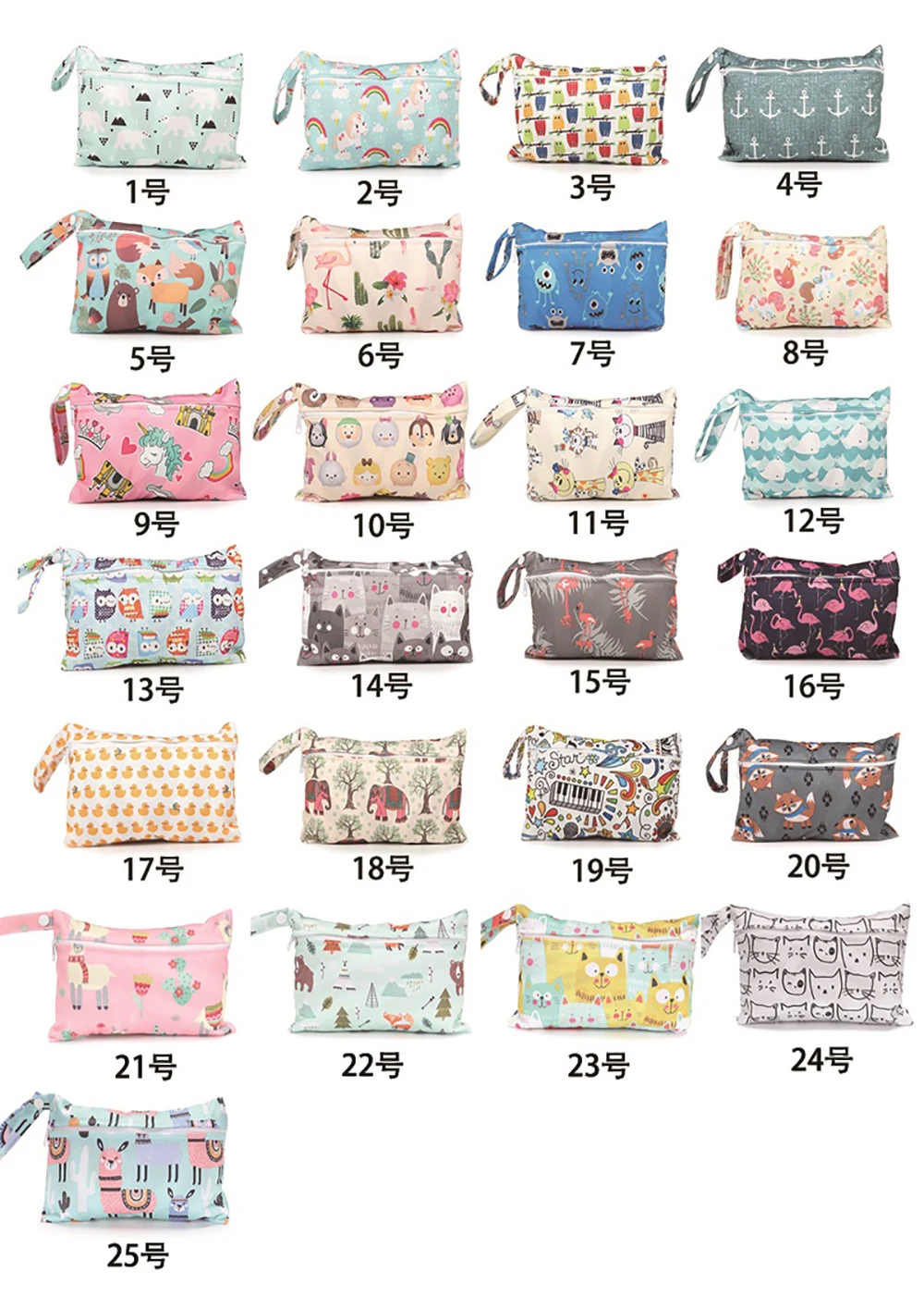Материал: водонепроницаемый полиэстер PUL Карман: один карман на молнии высокого качества Ручка: ручка с защелкой Рисунок: напечатанный влажный мешок Размеры/педикюра задняя часть: около 15*22,5 см мешок Использование: для прокладки для кормления; Менструальные прокладки; Детские подгузники