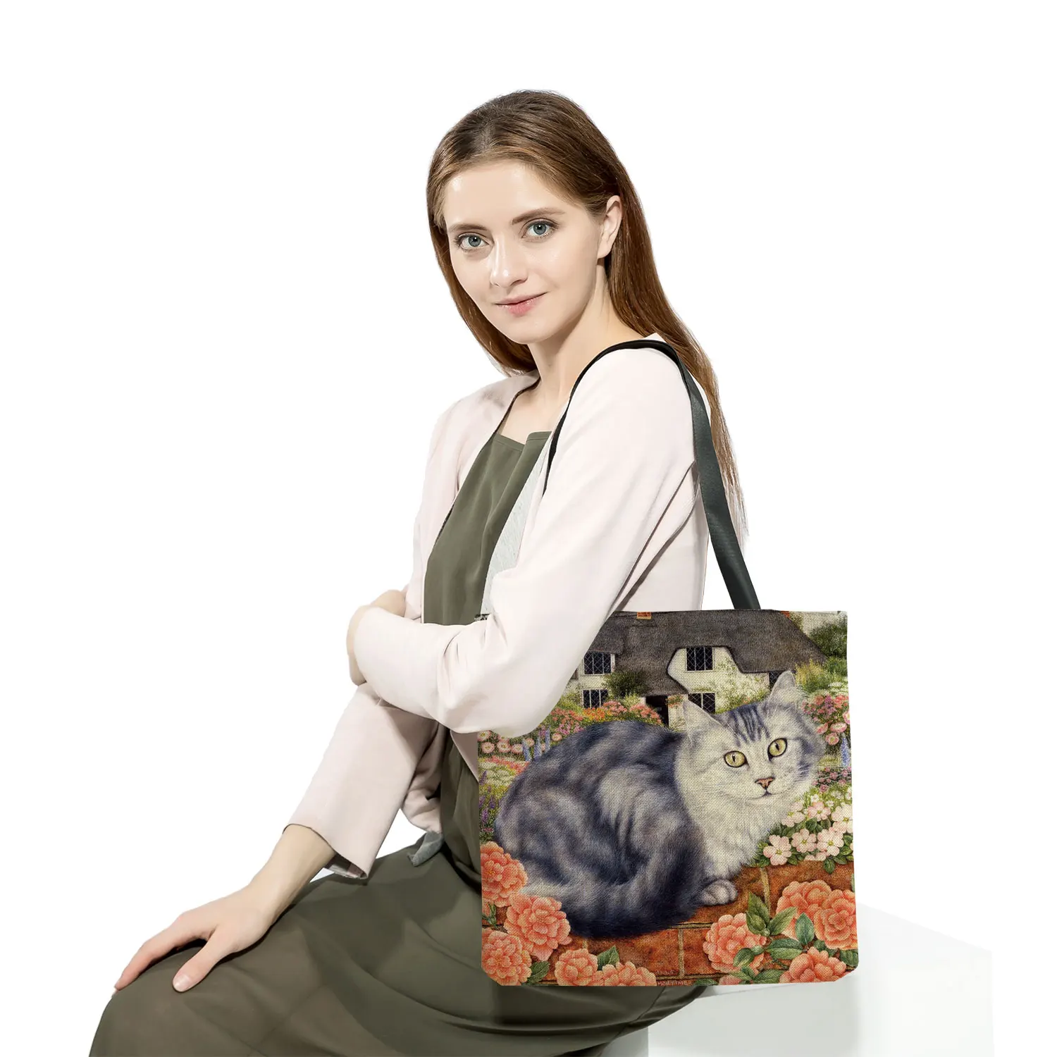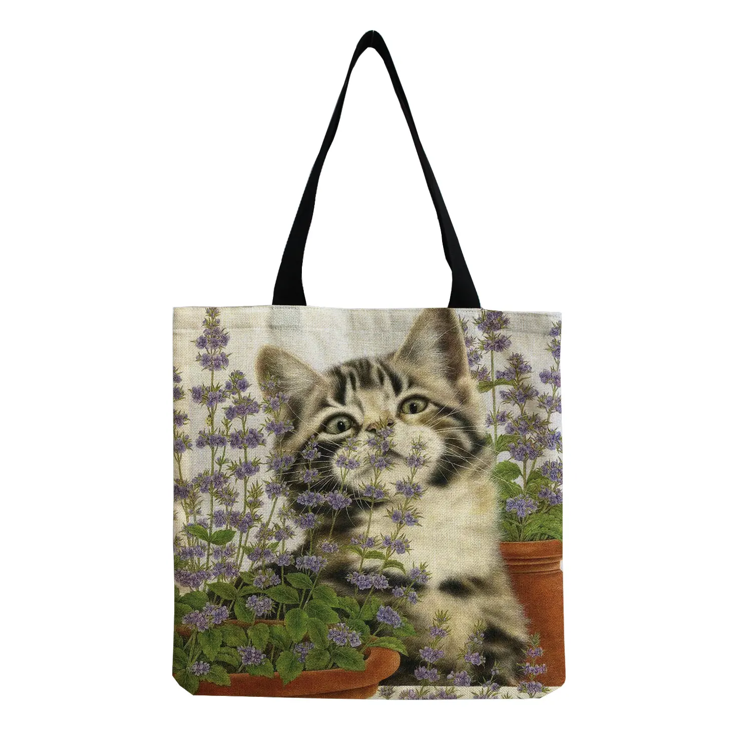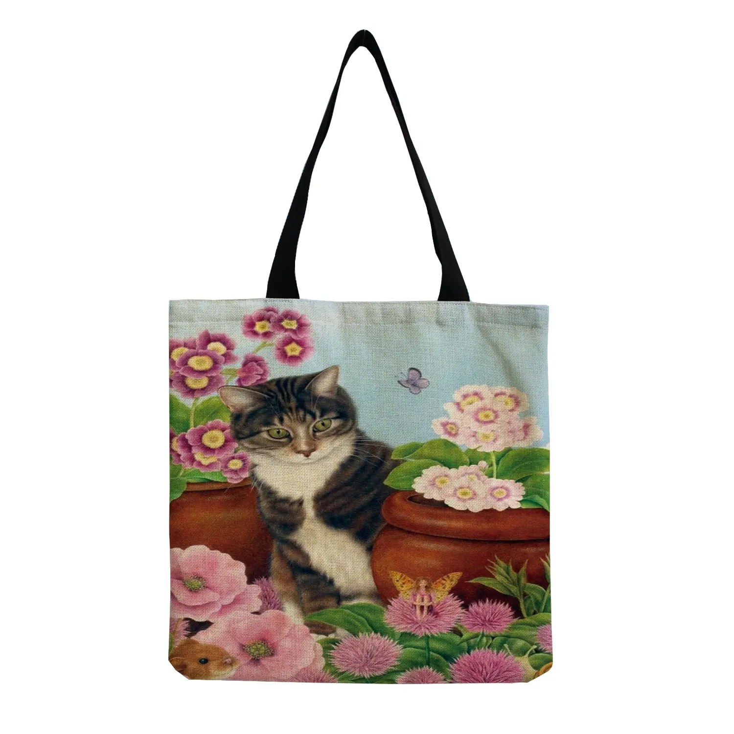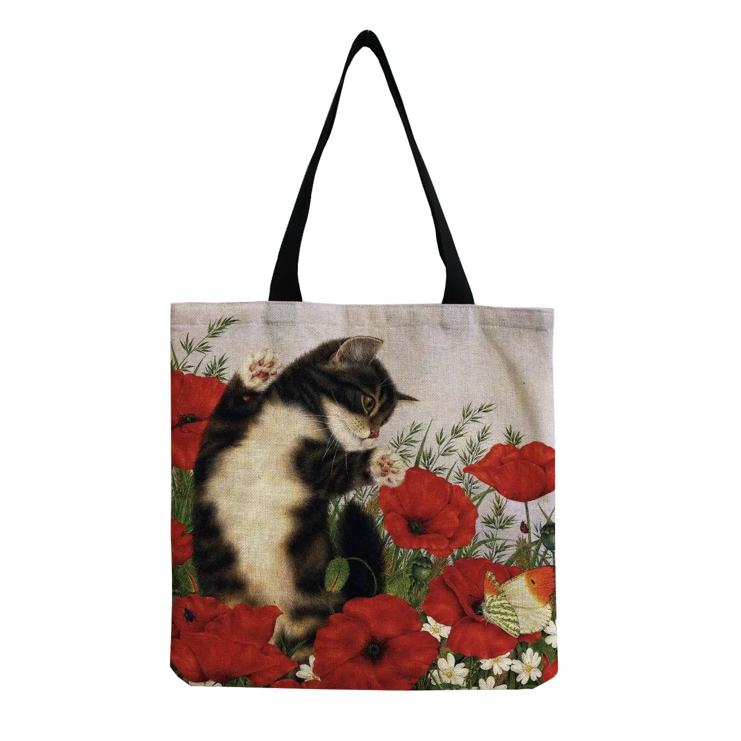 Женские дизайнерские сумки-тоуты с милым котом и цветочным принтом, женская сумка, Большая складная сумка для покупок для продуктов, кухонные сумки