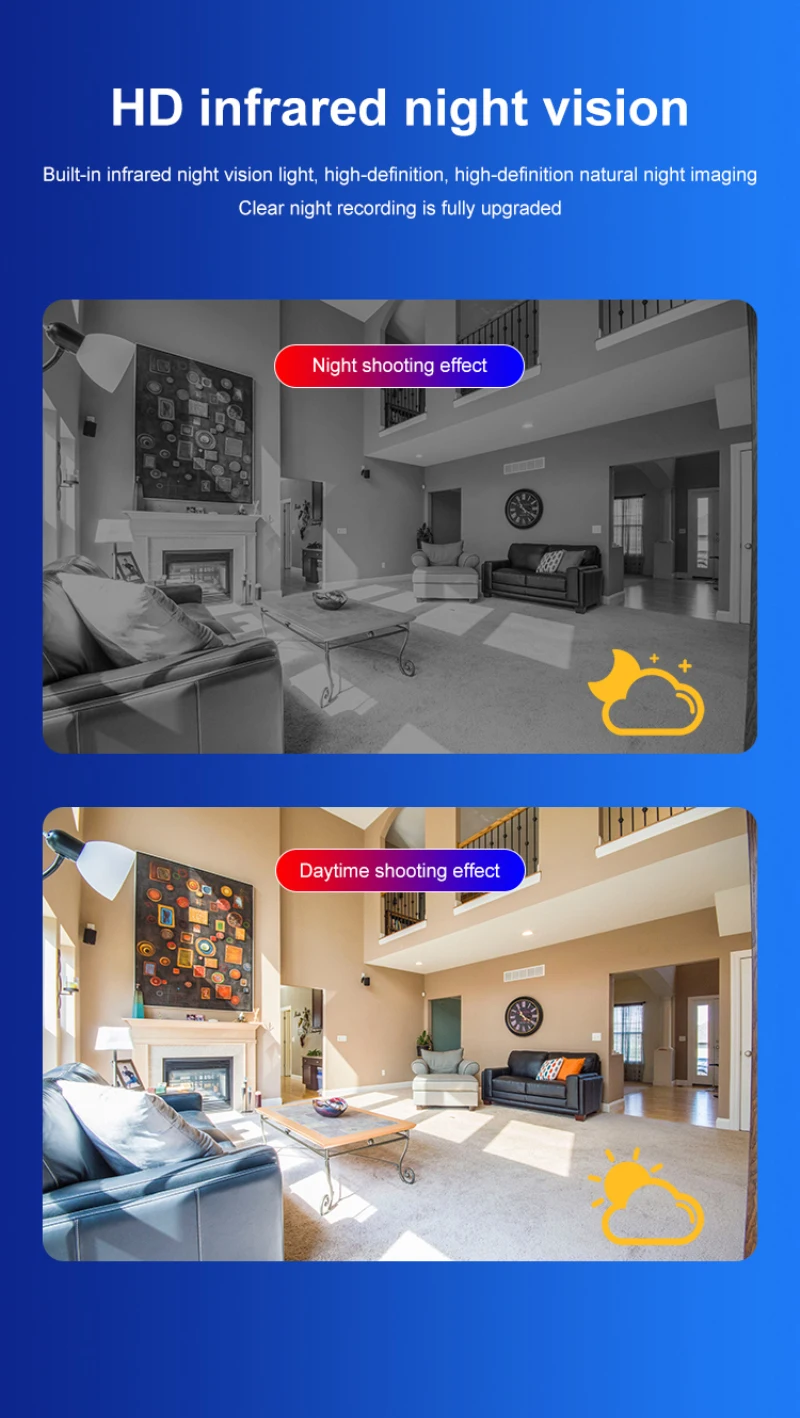 Камера может работать по Wi-Fi (2,4 ГГц Wi-Fi только) Wi-Fi или без. Когда он работает без Wi-Fi, пожалуйста, вставьте tf-карту (tf-карта не входит в комплект) и включите, камера будет записывать и сохранять видео файлы на sd-карту (sd-карта не входит в комплект)