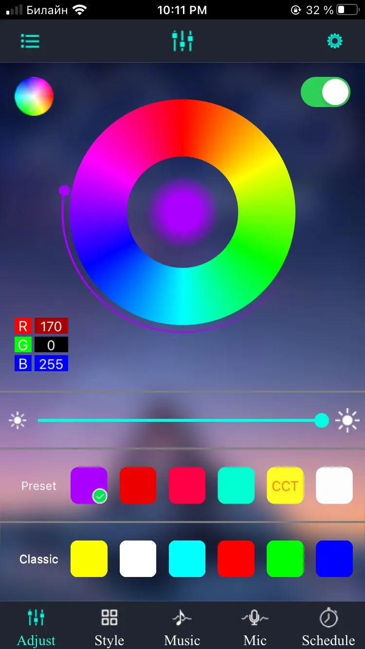 Очень хорошая лента, приложение отличное, не получилось сделать так чтоб ленов мигала под свод музыку, а не музыку с приложения, но не критично. Много разных цветов, супер. Покупайте!