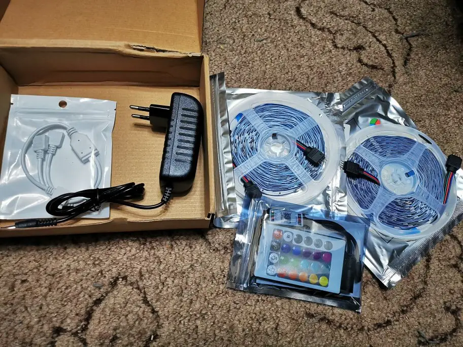 Ленту доставил курьер, за 3 дня до ожидаемой доставки. На ленте есть двусторонний скотч что значительно упрощает установку ленты. Настройки яркости, цветов много, различные режимы.