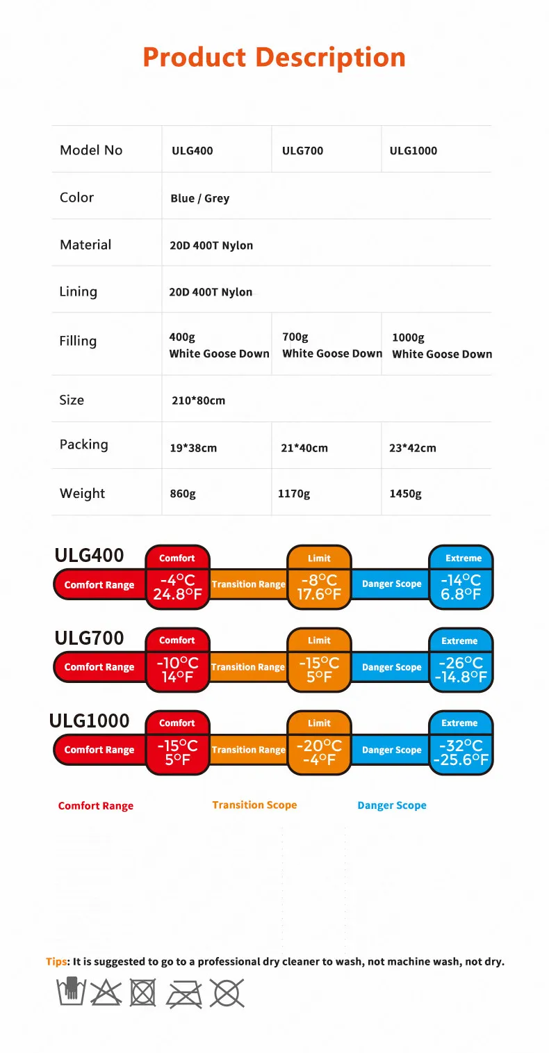 Номер модели: ULG700Цвет: синий/серыйМатериал: нейлон 20D 400TПодкладка: 20D 400T нейлонНаполнитель: 700 г белый гусиный пух 800FPРазмер: 210*80 смУпаковка: 21*40 смКомфортная температура: -10 ℃Температура ограничения: -15 ℃Предельная температура: -26 ℃Вес: 1170 г
