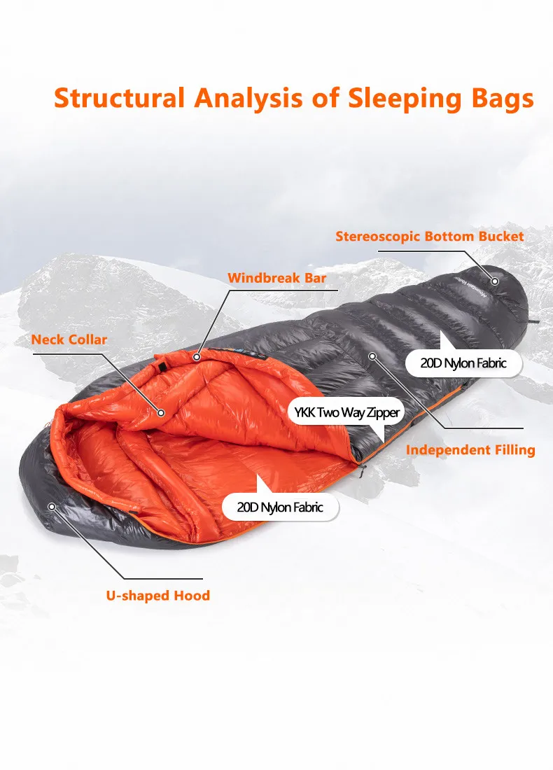 Номер модели: ULG1000Цвет: синий/серыйМатериал: нейлон 20D 400TПодкладка: 20D 400T нейлонНаполнитель: 1000 г белый гусиный пух 800FPРазмер: 210*80 смУпаковка: 23*42 смКомфортная температура: -15 ℃Температура ограничения: -20 ℃Предельная температура: -32 ℃Вес: 1450 г