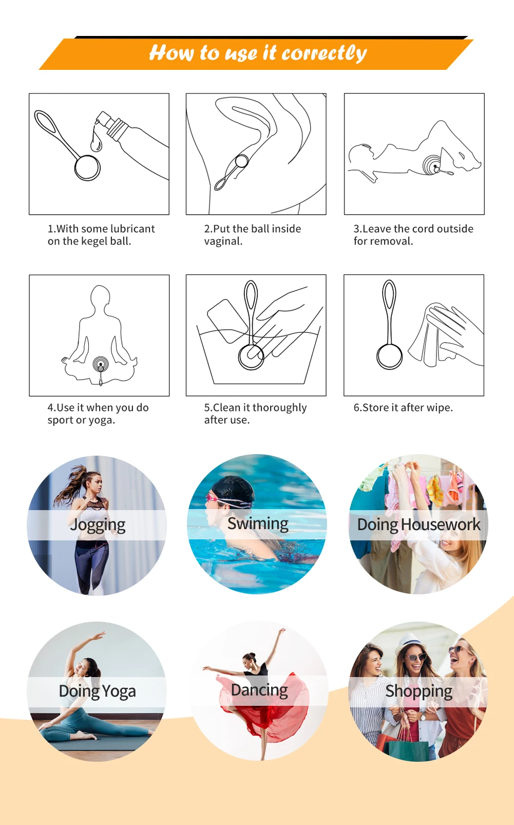 · 1. Добавьте смазку к шарику Кегеля.· 2. Откройте ноги, расслабьте влагалище, а затем медленно вдавите мяч во влагалище.· 3. Вы можете заниматься некоторыми видами спорта, такими как ходьба, плавание и работа по дому, и металлический шар будет сталкиваться с внутренней поверхностью, когда он движется.· 4. Мойте с мылом и теплой водой до и после использования, а затем дайте высохнуть естественным образом на воздухе.