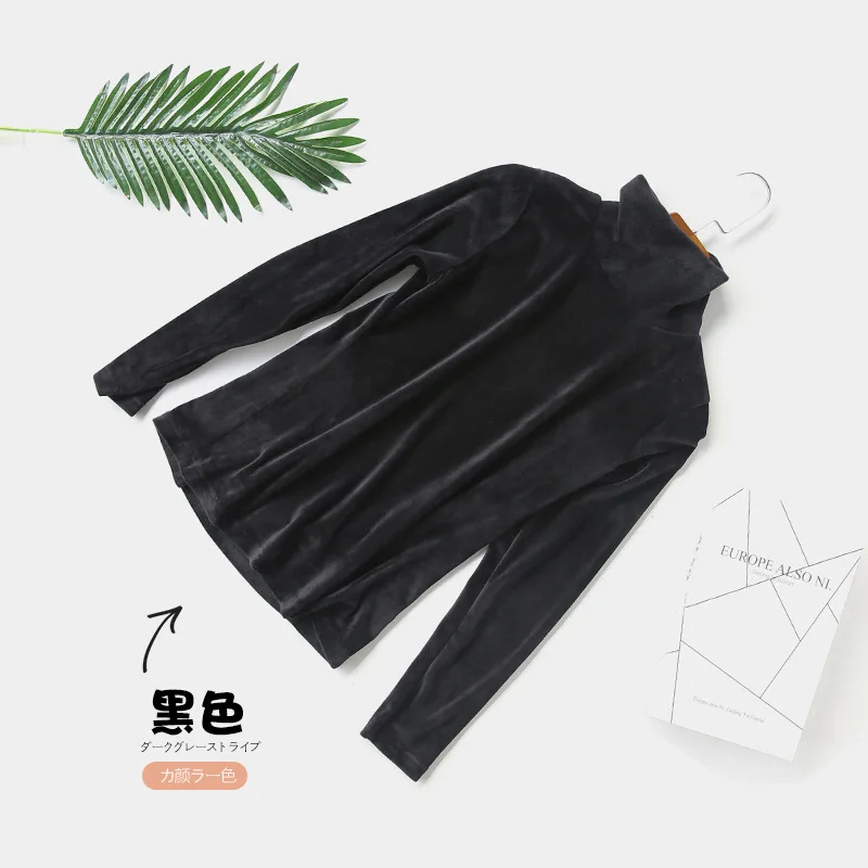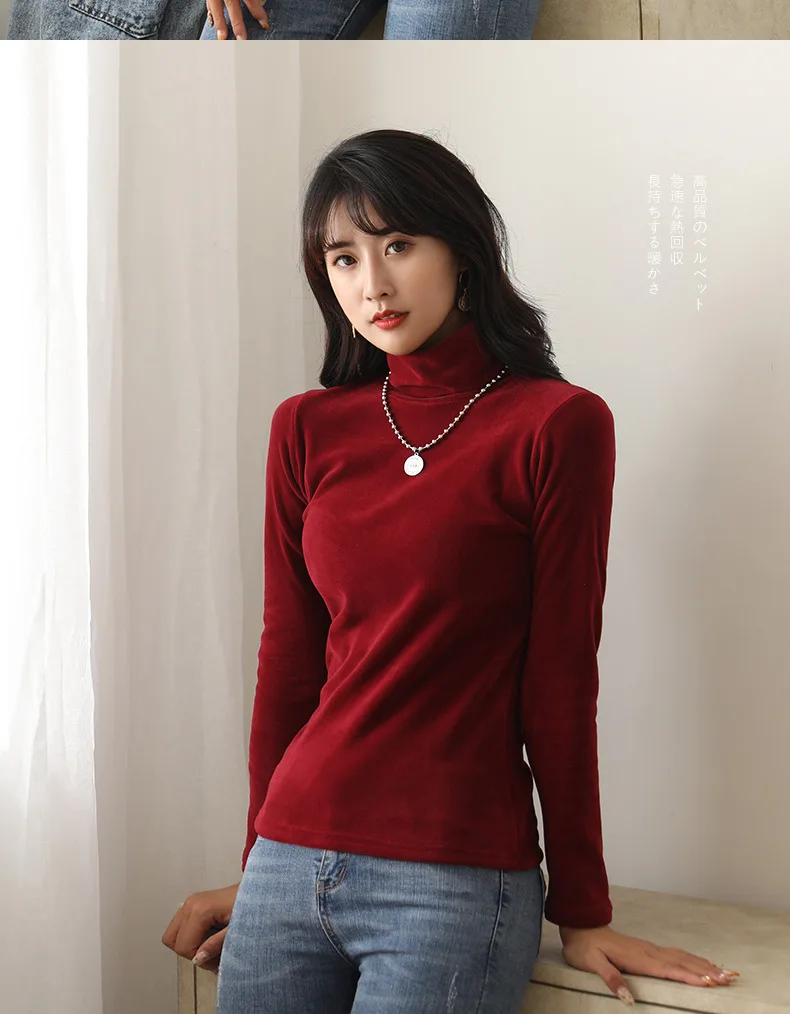 Водолазка, женская футболка с длинным рукавом, флисовая подкладка, однотонный, Осень-зима, тонкий черный джемпер, модный теплый бархатный женский топ