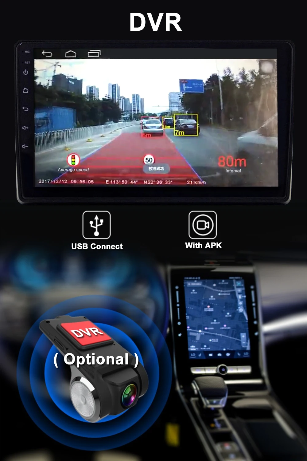 Фронтальная камера DVR с функцией ADAS, мониторинг скорости транспортного средства в реальном времени, расстояния транспортного средства и других мощных функций.