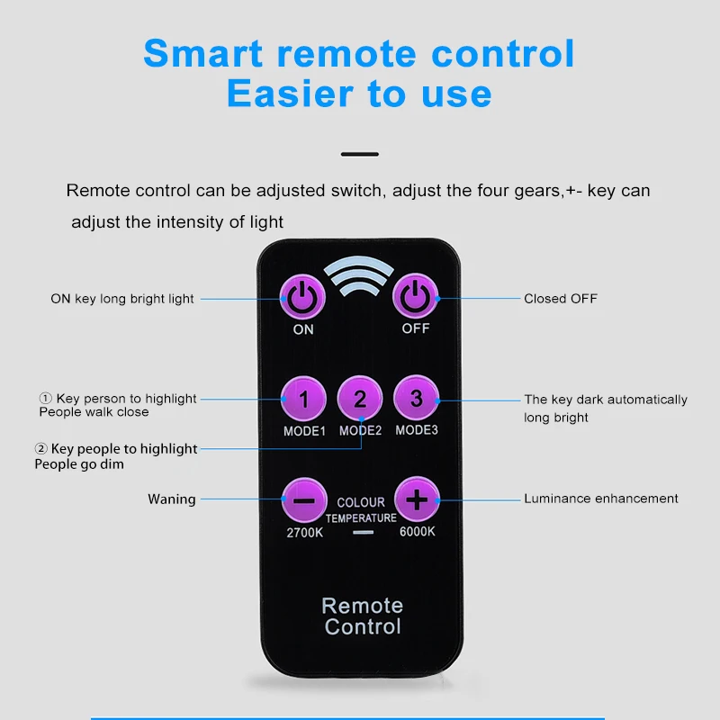 Режим 2: тусклый светильник + индукция человеческого тела + светильник управления. Темный светильник автоматически включается ночью. Когда человек близок к 3-5 м, сильный светильник включается в течение 20-25 с, а затем Темный светильник автоматически включается.