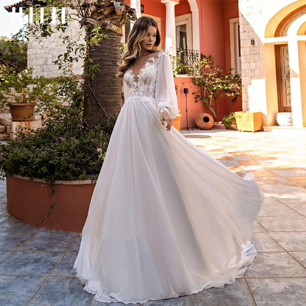 Женское свадебное платье с рукавами-фонариками JEHETH, шифоновое ДРАПИРОВАННОЕ кружевное ТРАПЕЦИЕВИДНОЕ ПЛАТЬЕ с круглым вырезом и рукавами-фонариками, 2022