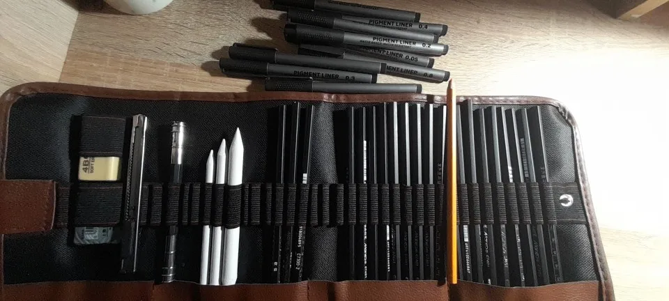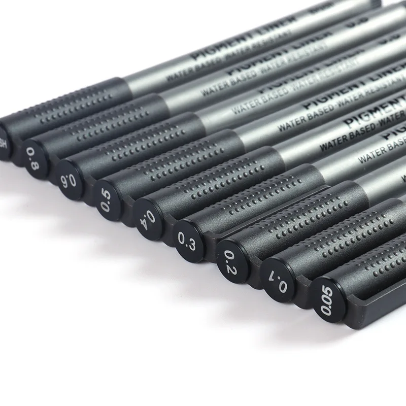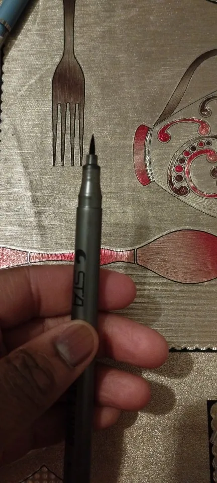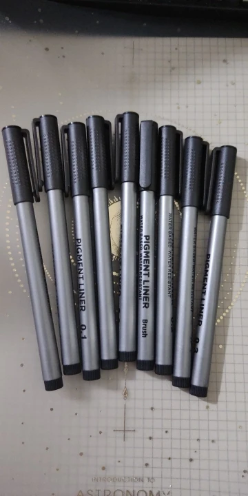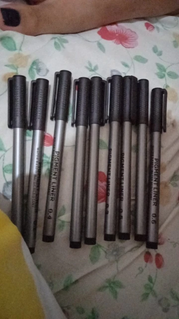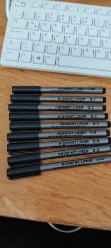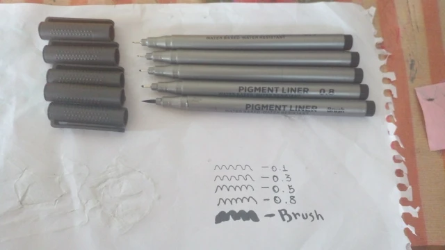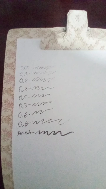 Маркери досить хорошої якості, малюють чітко і м'яко. Замовляв собі всі 9 розмірів і вони дійсно різняться між собою. Пензель (brush), що йде у комплекті може виводити досить широкі лінії, але фарбі потрібно дати часу впитатися та висохнути на папері, тому що одразу після нанесення з легкістю можна розтерти лінію.