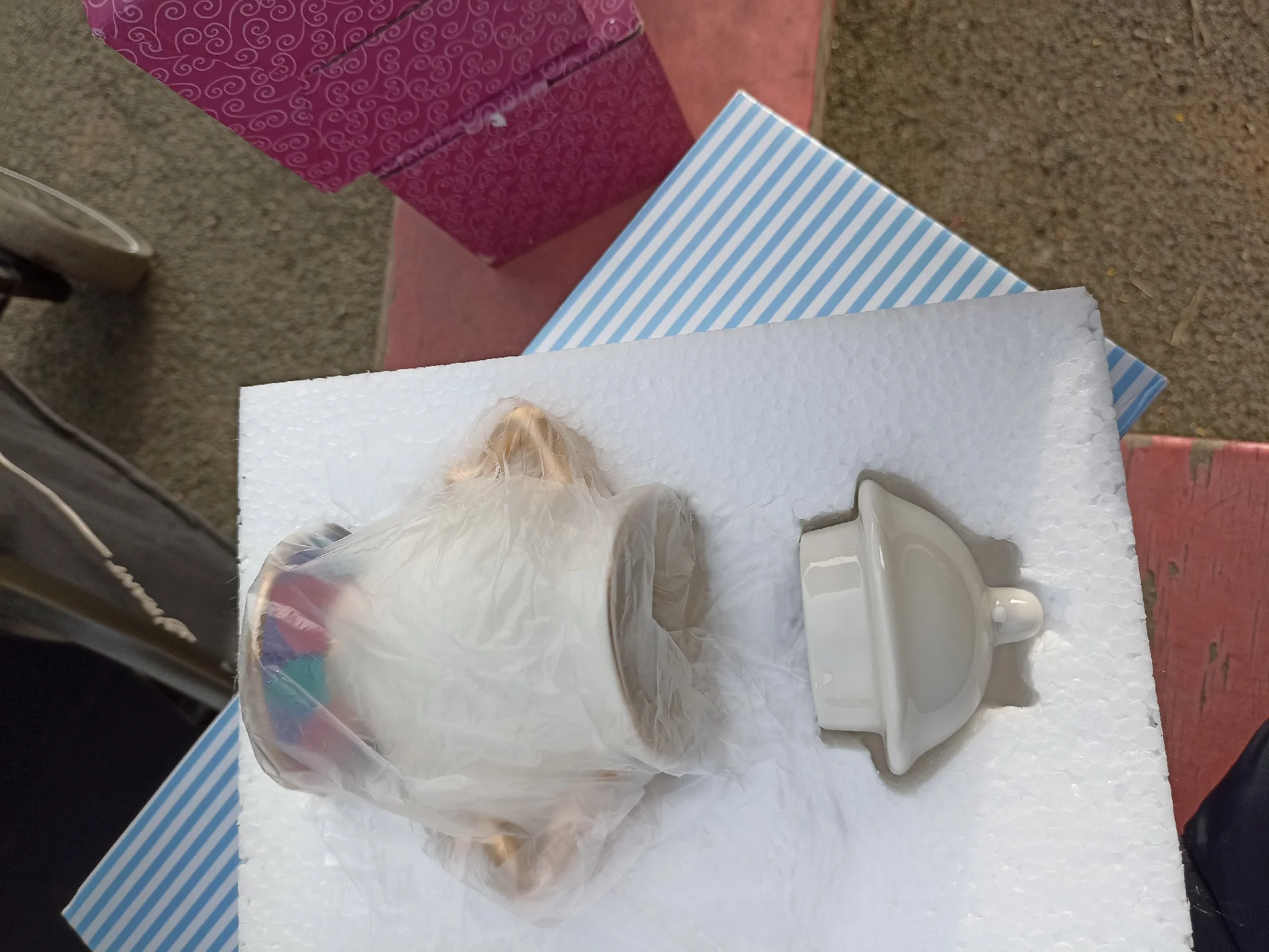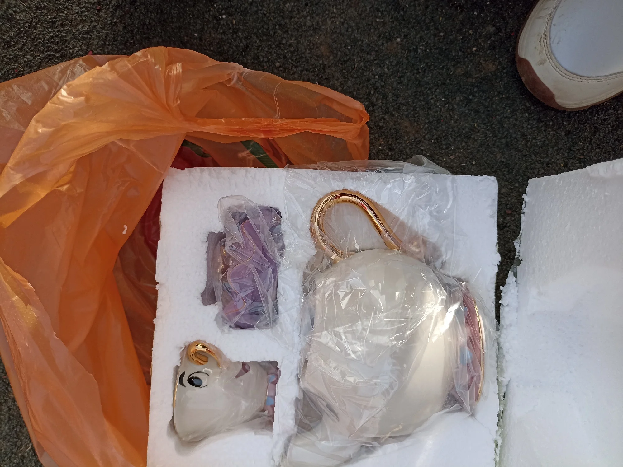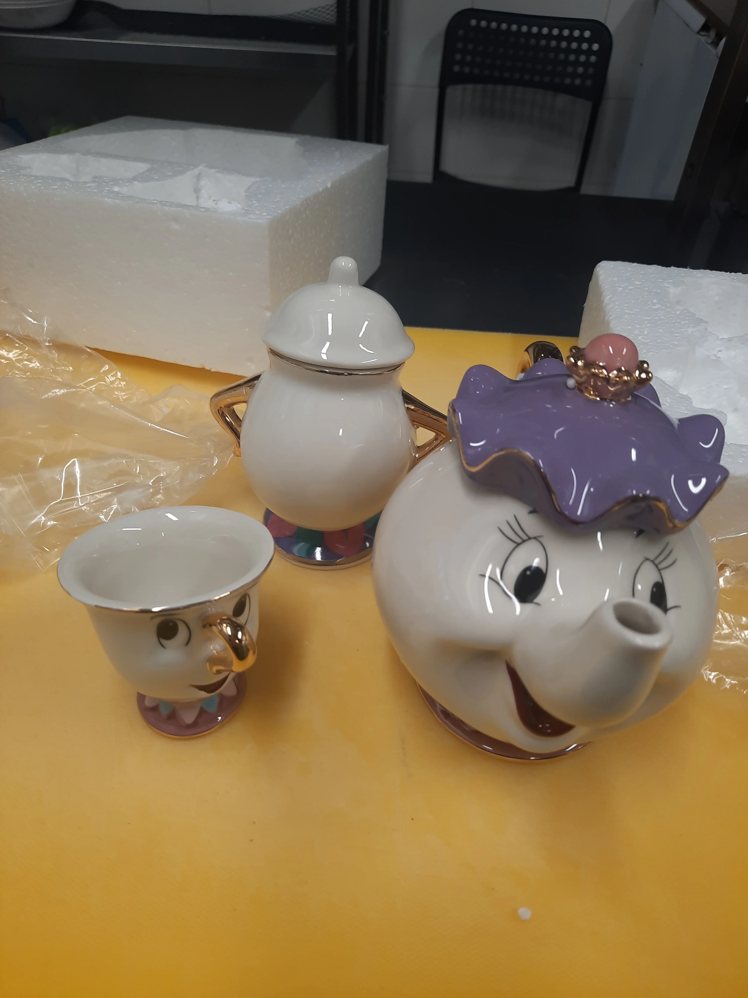 Вроде усё целое, чайник, 3 кружечки и сахарница. На подарок дочери. Хотя она ещё мультик не смотрела.