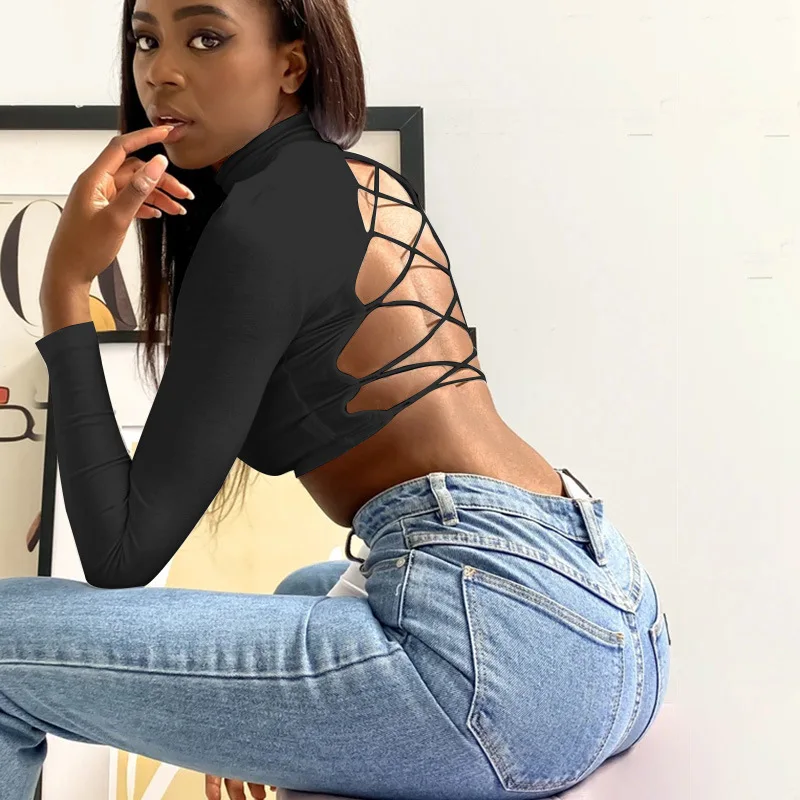 Женский топ с открытой спиной SVOKOR, сексуальный черный топ с длинными рукавами, облегающая Элегантная футболка с открытой спиной, красивый топ со шнуровкой сзади