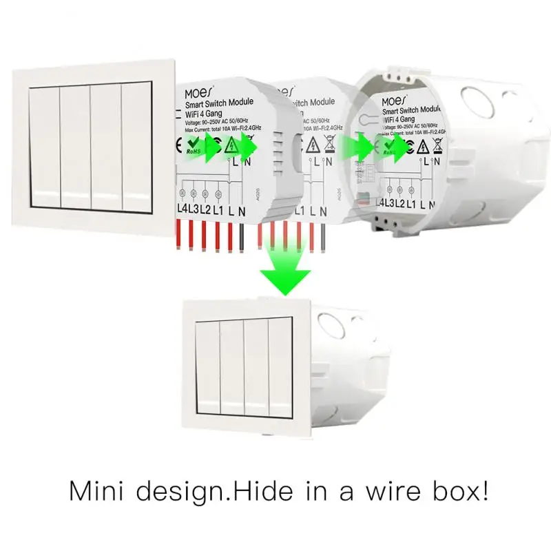 1. Умный модуль Wi-Fi 4 Gang поставляется с мини-дизайном для 4 переключателей в соответствии с британскими и европейскими настенными переключателями; Компактный размер позволяет легко поместиться без изменений в вашем домашнем декоре; превращает совместимые продукты в умные за считанные секунды; Позволяет независимое управление традиционным переключателем без помех; Подходит для перезапуска и сброса переключателя.