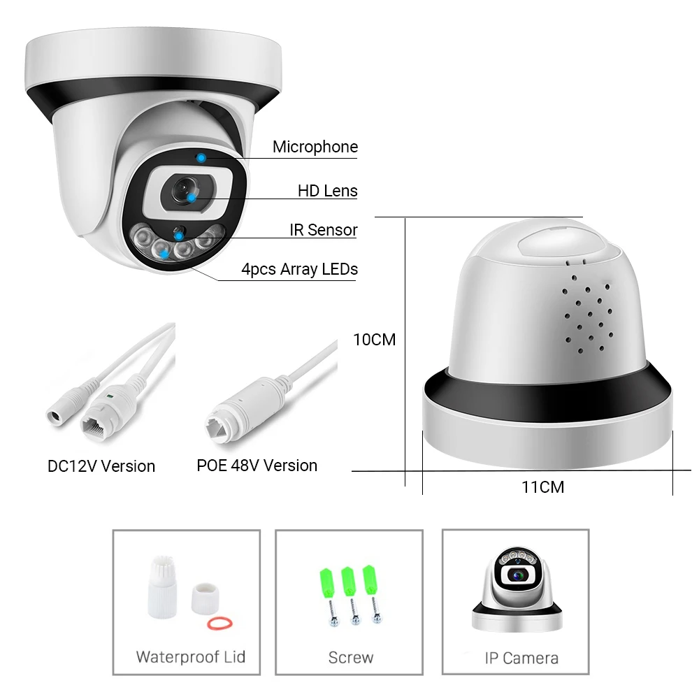 • Изображение Senor:8 Мп: 1/3 дюйма GC80534MP:1/3 "GC4053• Почтовый поток:8 Мп: 3840*2160P(Max15fps)4 МП: 2560*1440P (макс25 кадров в секунду)• Мин. Освещение: Цвет: 0,05 Lux; Б/у: 0.005Lux (ИК вкл.)• Улучшенное Сжатие видео H.265/H.264• Супер низкая скорость, высокое качество изображения• Поддержка 2D/3D шумоподавления, Цифровой Широкий Динамический• Поддержка onvif, совместима с Hikvision,Dahua,Xmeye NVR• Просмотр мобильный телефон (iOS,android) зависит от приложения NVR• Встроенный микрофон, поддержка аудиозаписи• 4 шт. в наборе, двойной светодиодный, поддержка цвета, ночное видение• Корпус из АБС-пластика, только для помещений• DV12 и 48 В POE опционально