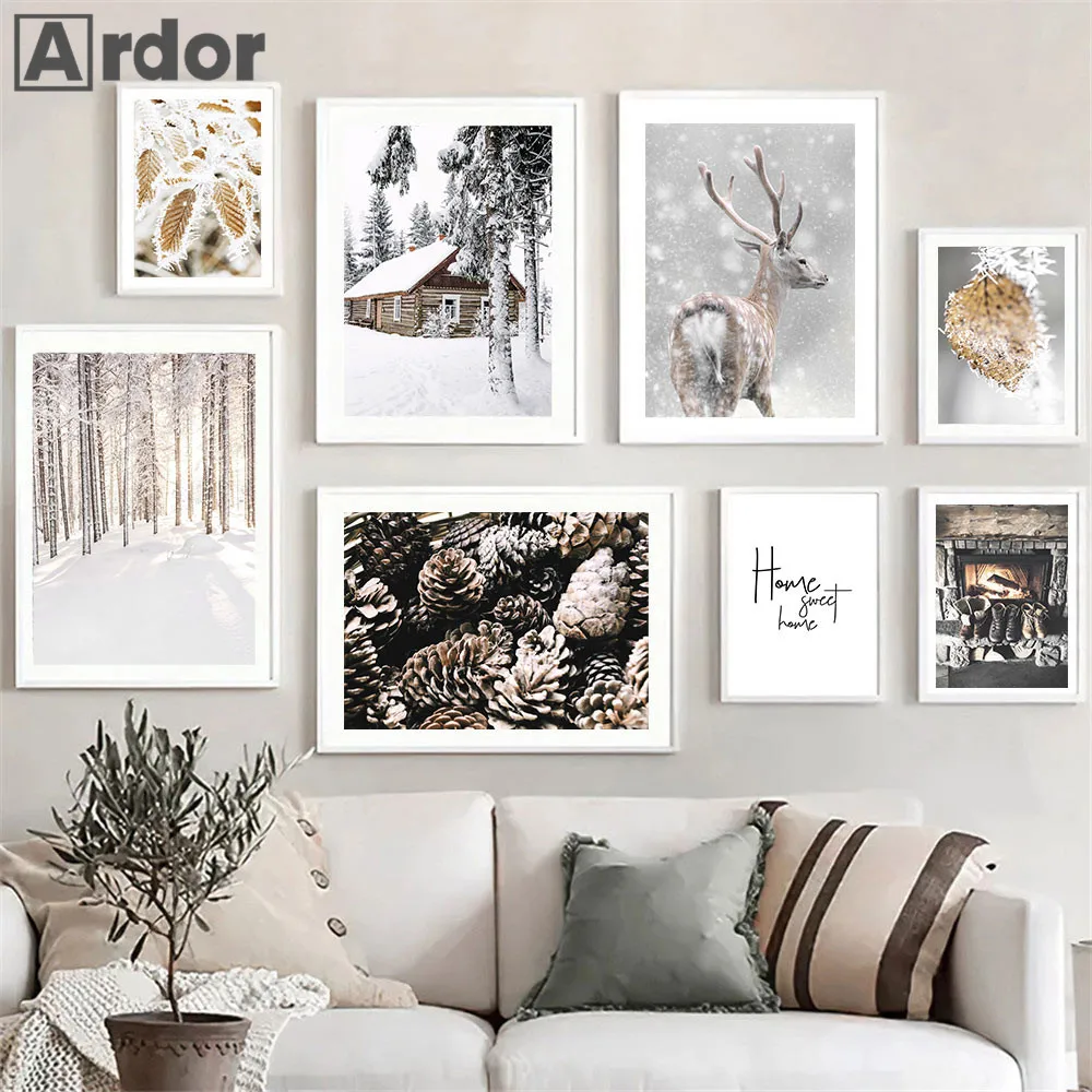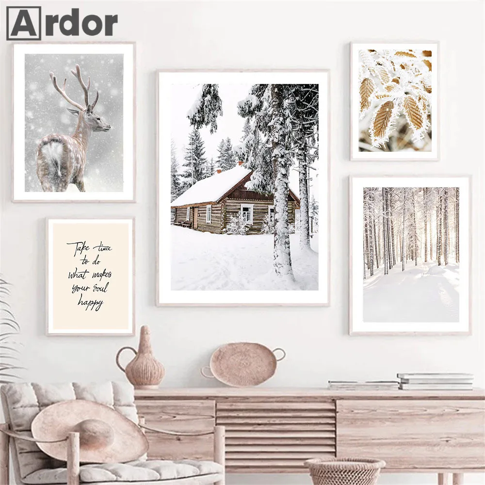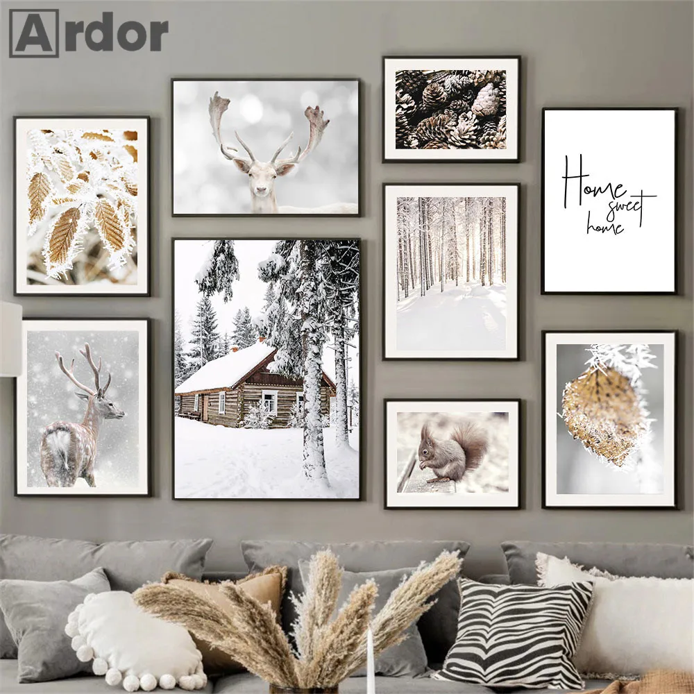 Зимний Снежный деревянный дом холст постер оставьте пинезон печать белка олень живопись пейзаж настенные картины декор для гостиной