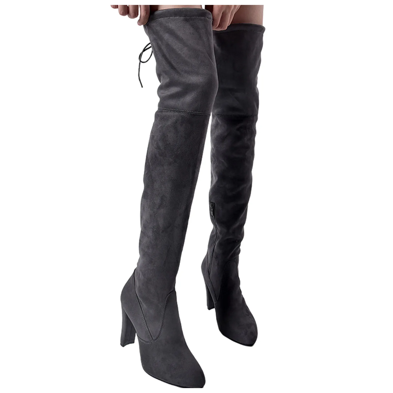 Женские сапоги выше колена, на Высоком толстом каблуке, заостренный носок, молния сбоку, модные однотонные ботфорты