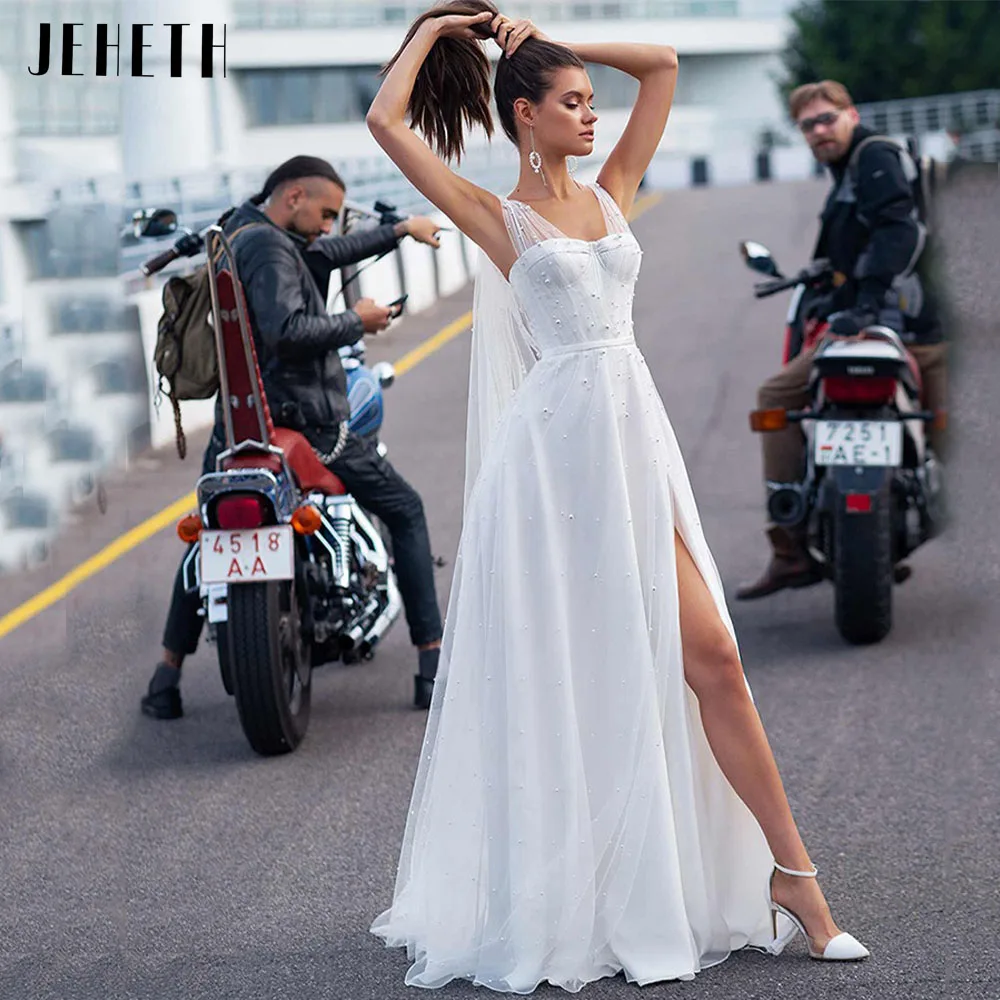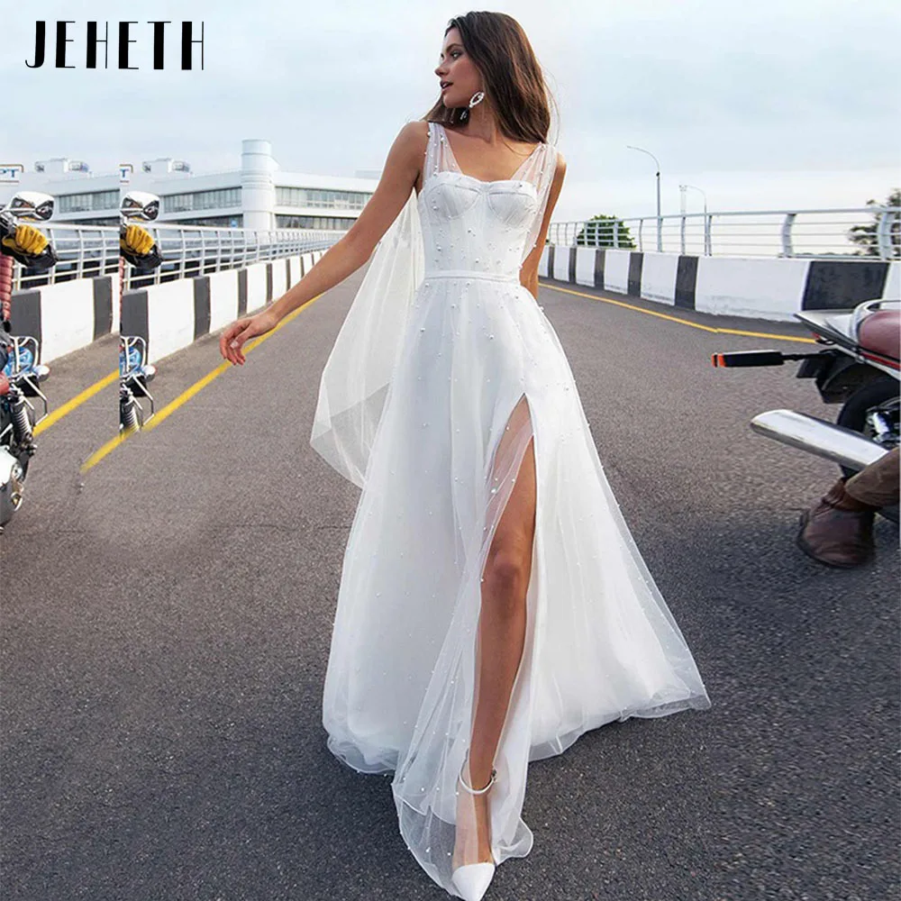 Женское свадебное платье JEHETH, фатиновое Плиссированное Платье с V-образным вырезом, разрезом сбоку и жемчужинами, лето 2021