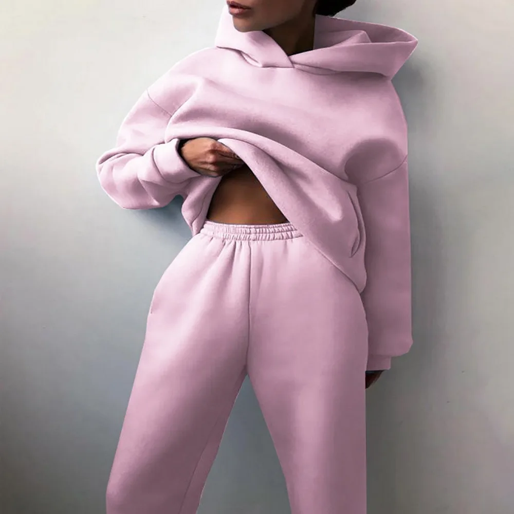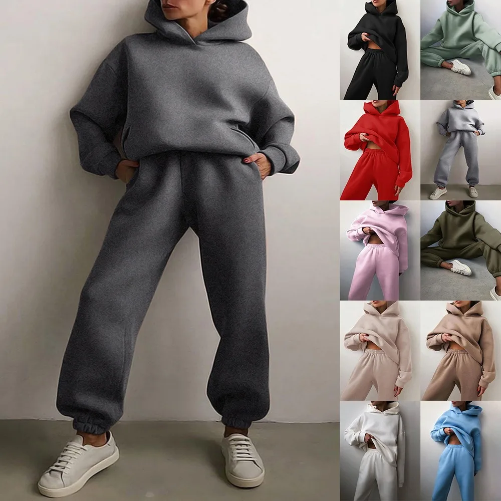 Женский спортивный костюм, толстый свитшот, повседневный однотонный комплект из двух предметов большого размера, женский спортивный костюм с толстовкой и длинными брюками, осень 2021