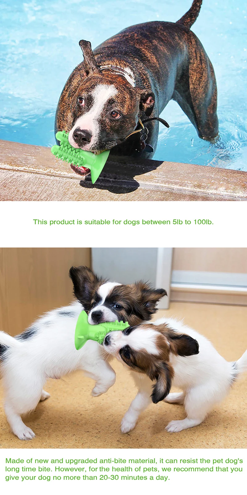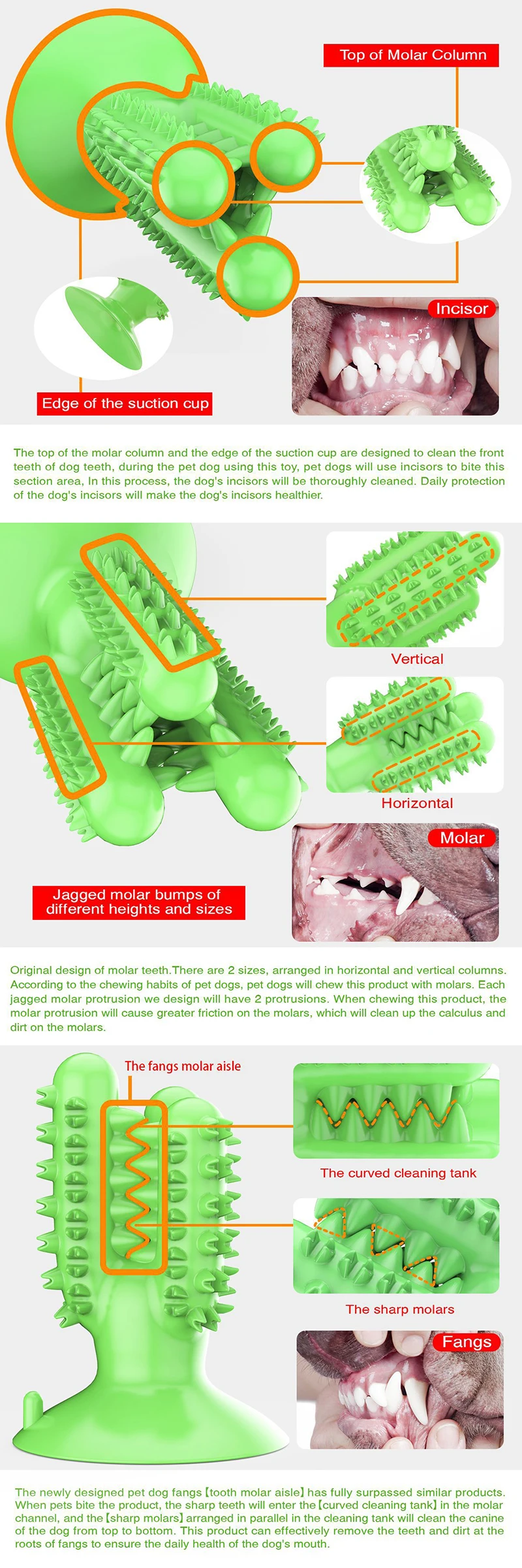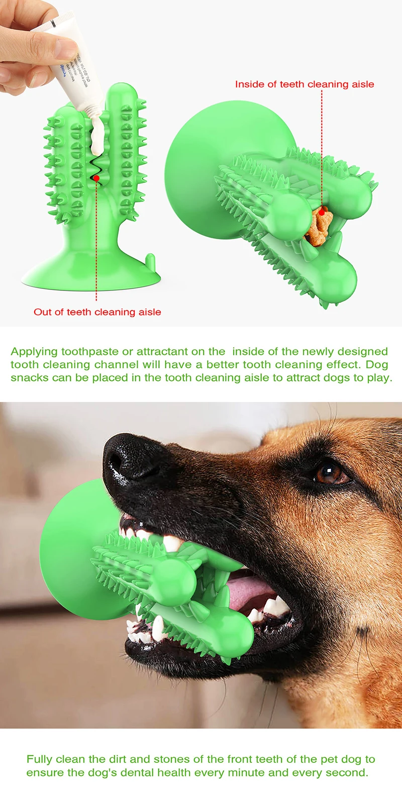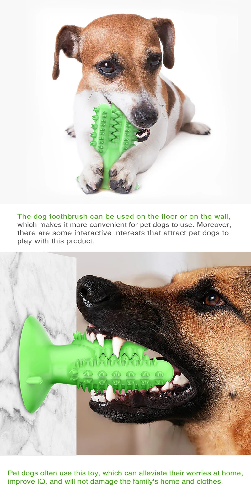 1. Он не будет укушен или разорван Изготовлен из обновленного материала против укуса Может противостоять долгосрочному укусу домашних собак 2. Принять новый тип канала очистки и зигзагообразной формы молярной выпуклой точки, В процессе игры с собакой он не только автоматически очищает зубы, Он также удаляет зубной камень/зубной камень, вызванный длительным потреблением корма для собак! 3. Можно разместить в канале чистки зубов Корм для собак или измельченные закуски Привлекайте собак, чтобы играть 4. Избавляет от беспокойства, убивает время, останавливает домашних животных от уничтожения мебели