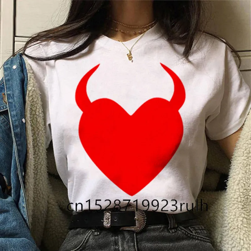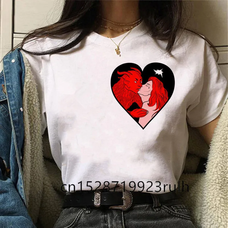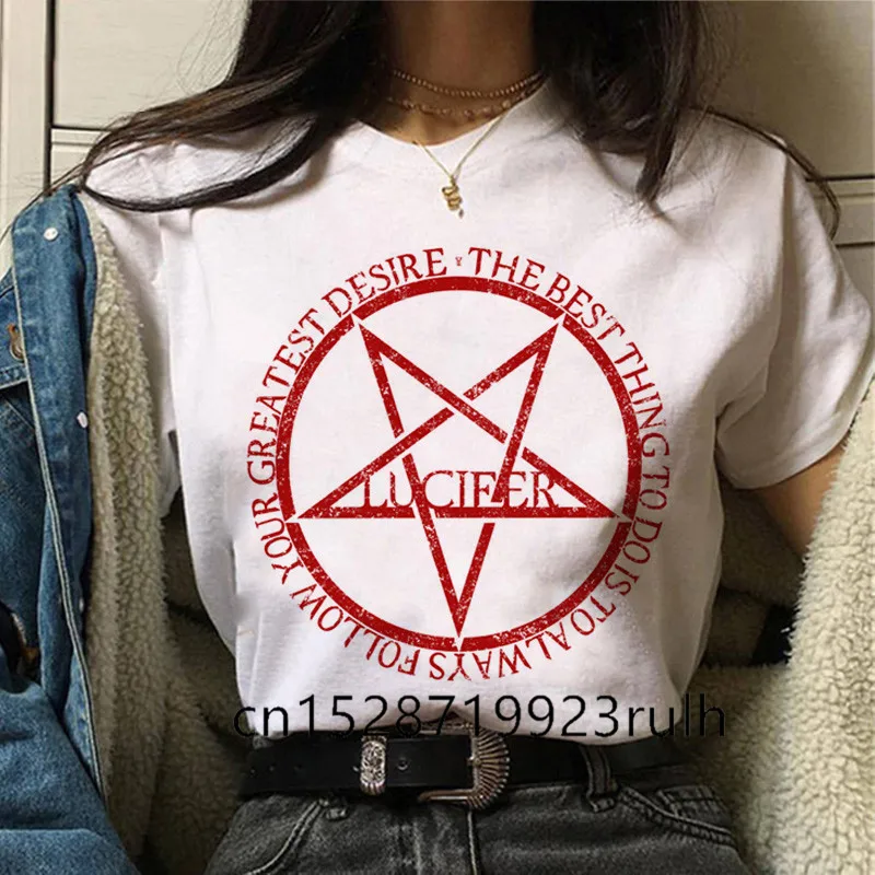 Футболка женская с принтом дьявола Люцифера, модная Свободная рубашка с коротким рукавом, белая одежда в стиле Харадзюку 90-х
