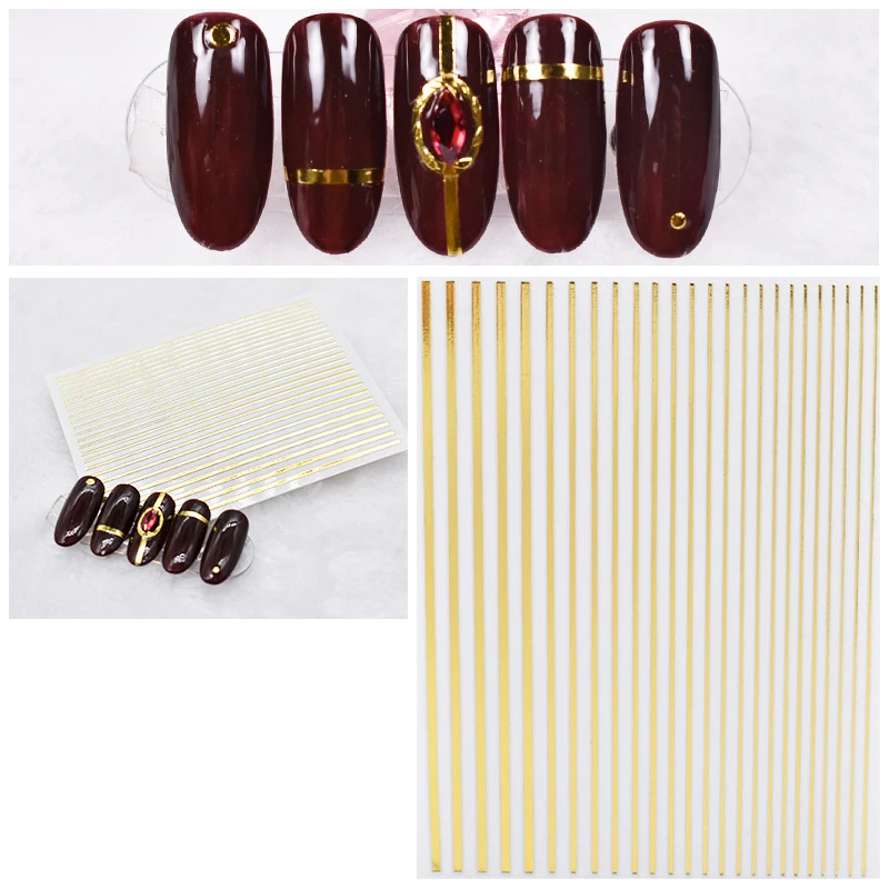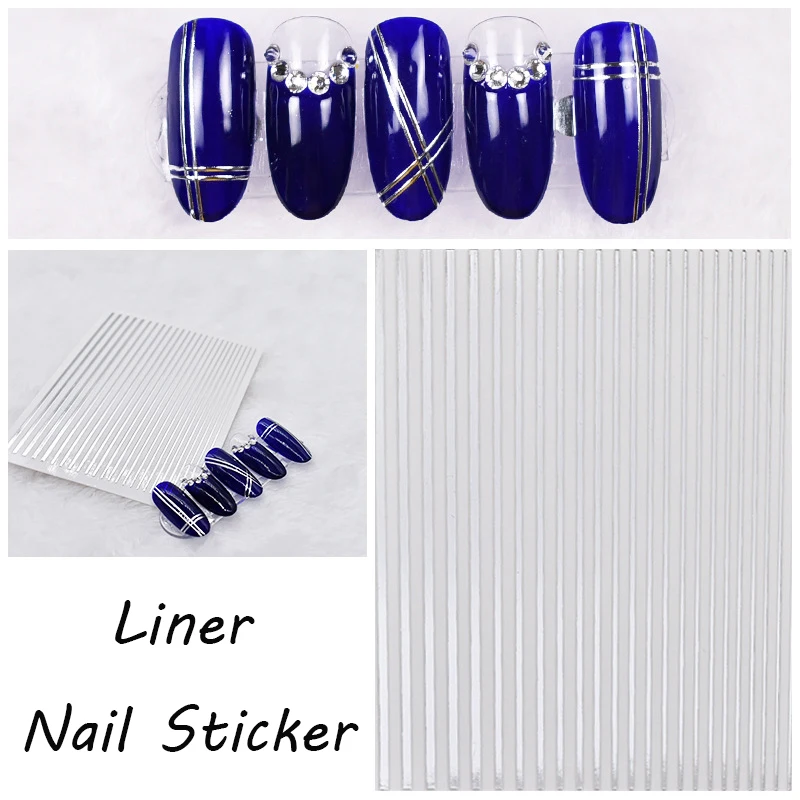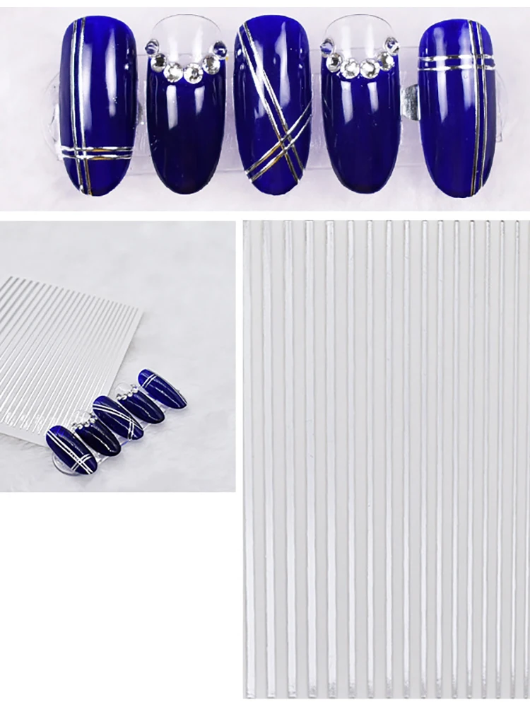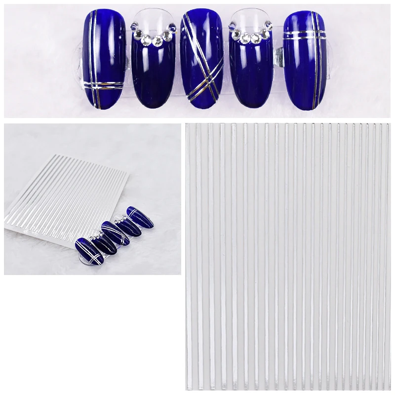 Золотистые Серебристые слайдеры 3 шт.лот, 3D наклейки для ногтей, прямые изогнутые вкладыши, полосатая лента, обертывания, геометрические украшения для дизайна ногтей