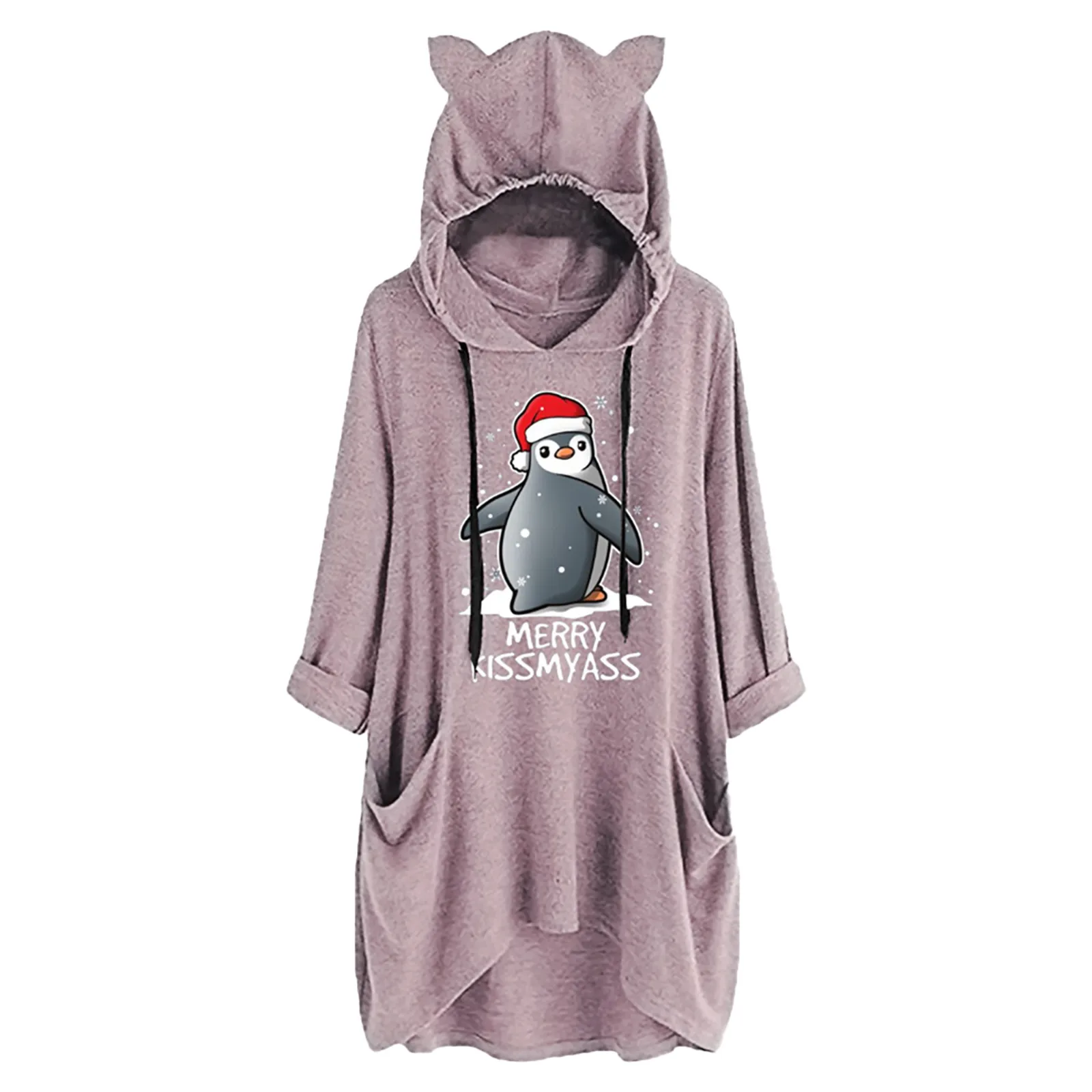 Женская Длинная толстовка с капюшоном, Повседневная Толстовка с капюшоном, с рисунком пингвина, средней длины, A40