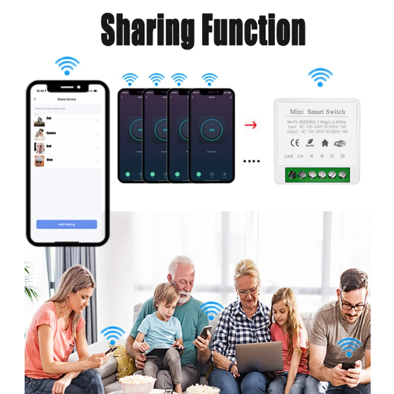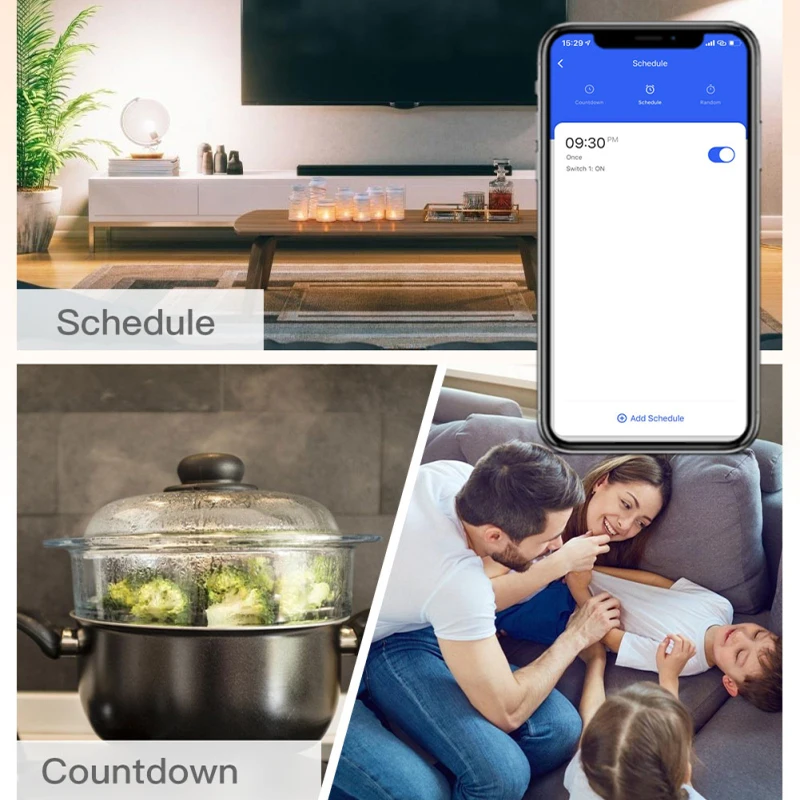 Управляйте включением и выключением устройства, синхронизацией, обратным отсчетом и другими функциями через мобильный телефон. Пока мобильный телефон имеет сеть, модуль переключателя дома можно контролировать по всему миру.