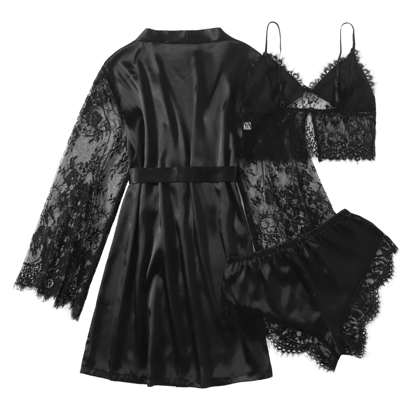 Женский пижамный комплект из 3 предметов, атласный кружевной топ на...