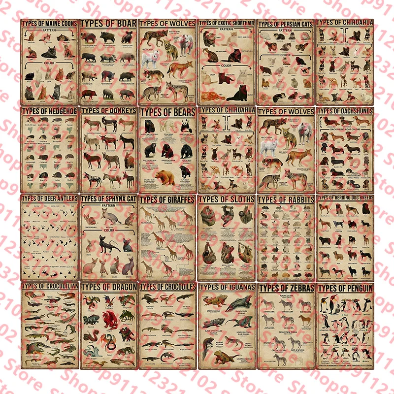Типы животных, металлический знак, винтажный декор, железная пластина, картины, кошка, собака, волк, животные, металлический потертый шик, Декор, табличка, настенный постер