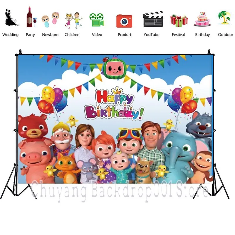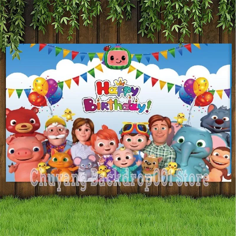 Фон Cocomelon для фотосъемки с изображением семьи красочных воздушных шаров детского дня рождения