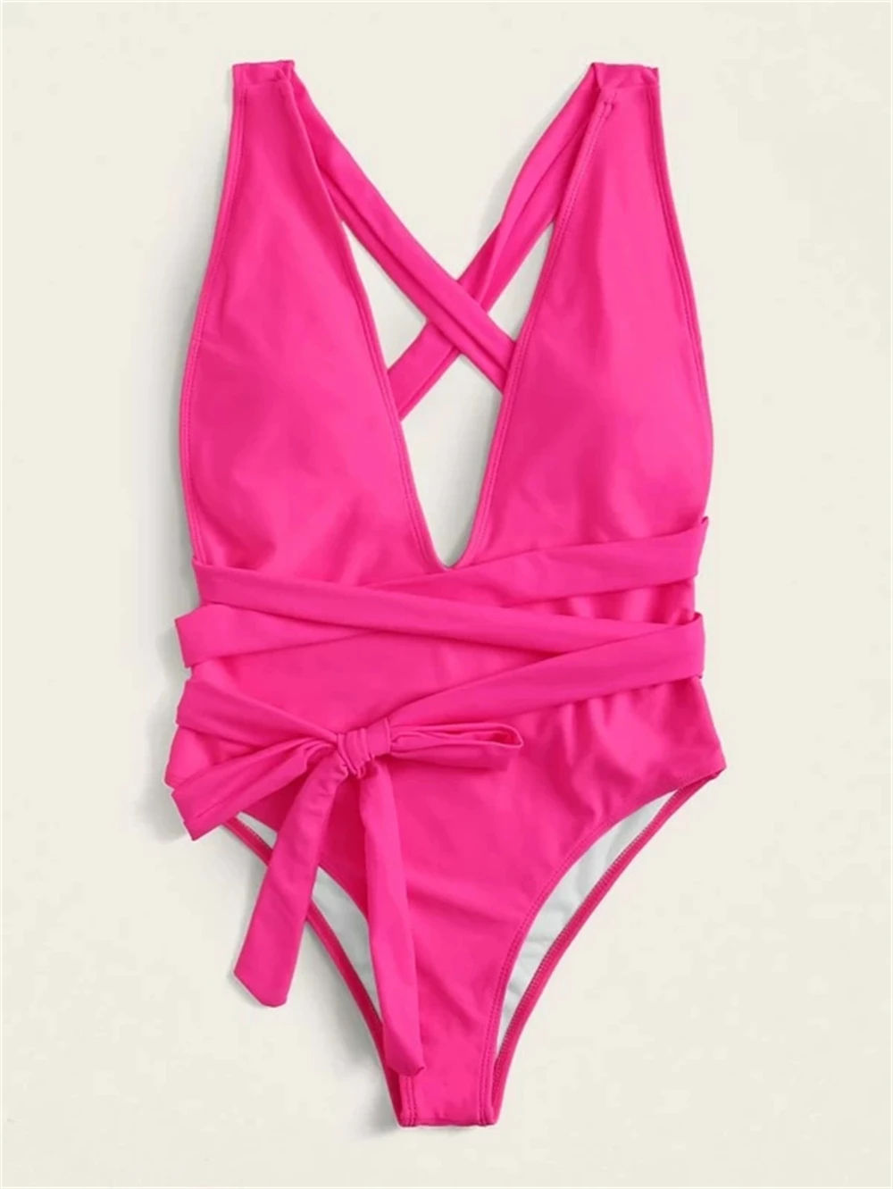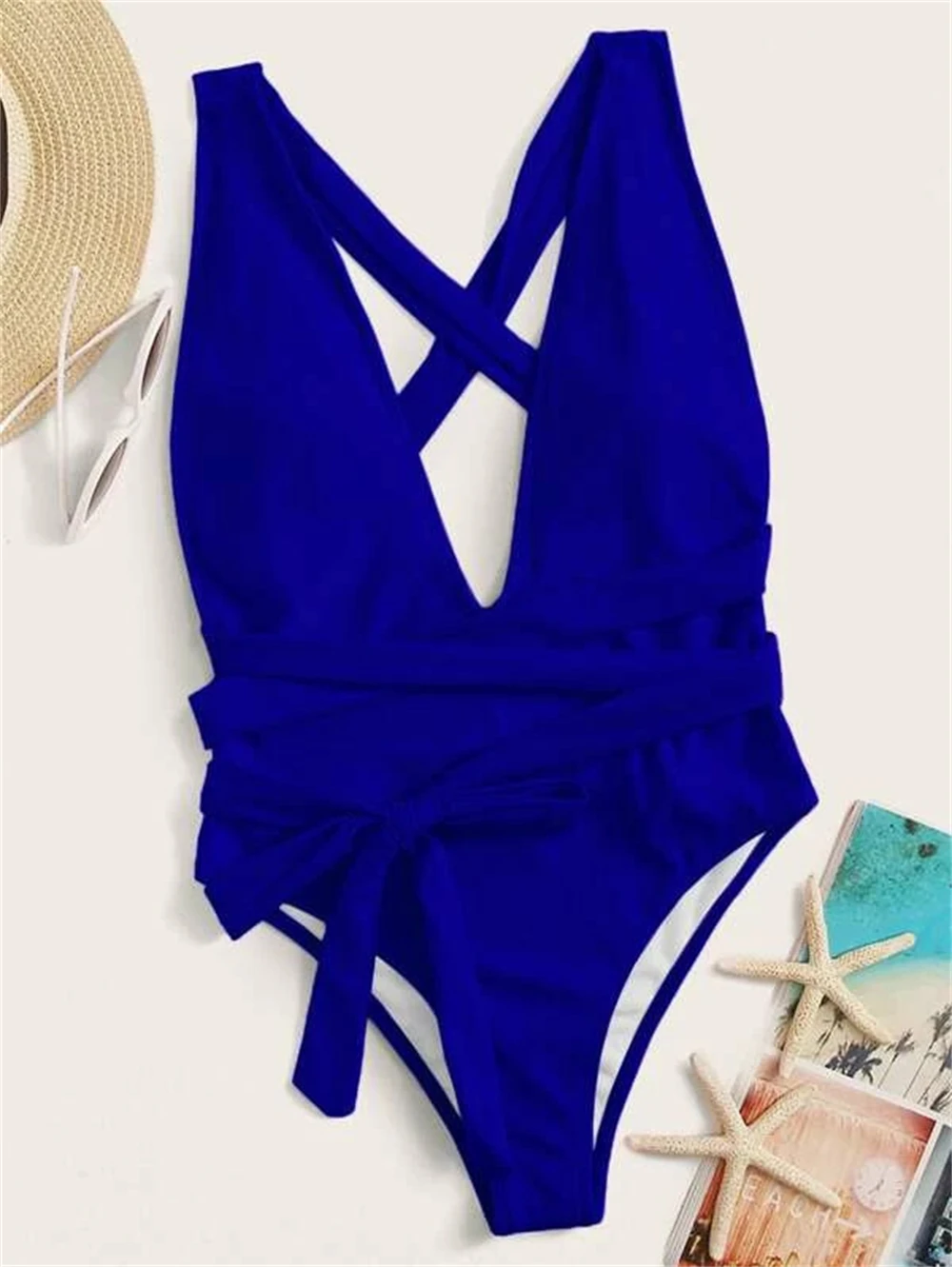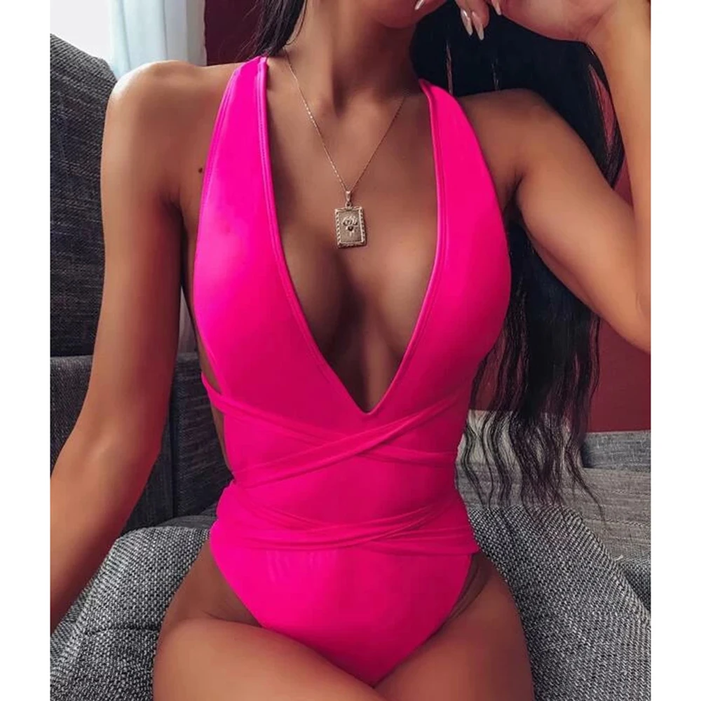 Купальник с глубоким V-образным вырезом, цельный сексуальный купальник с перекрестной спиной, Женский монокини с высокой талией, однотонный боди с открытой спиной, женский купальный костюм