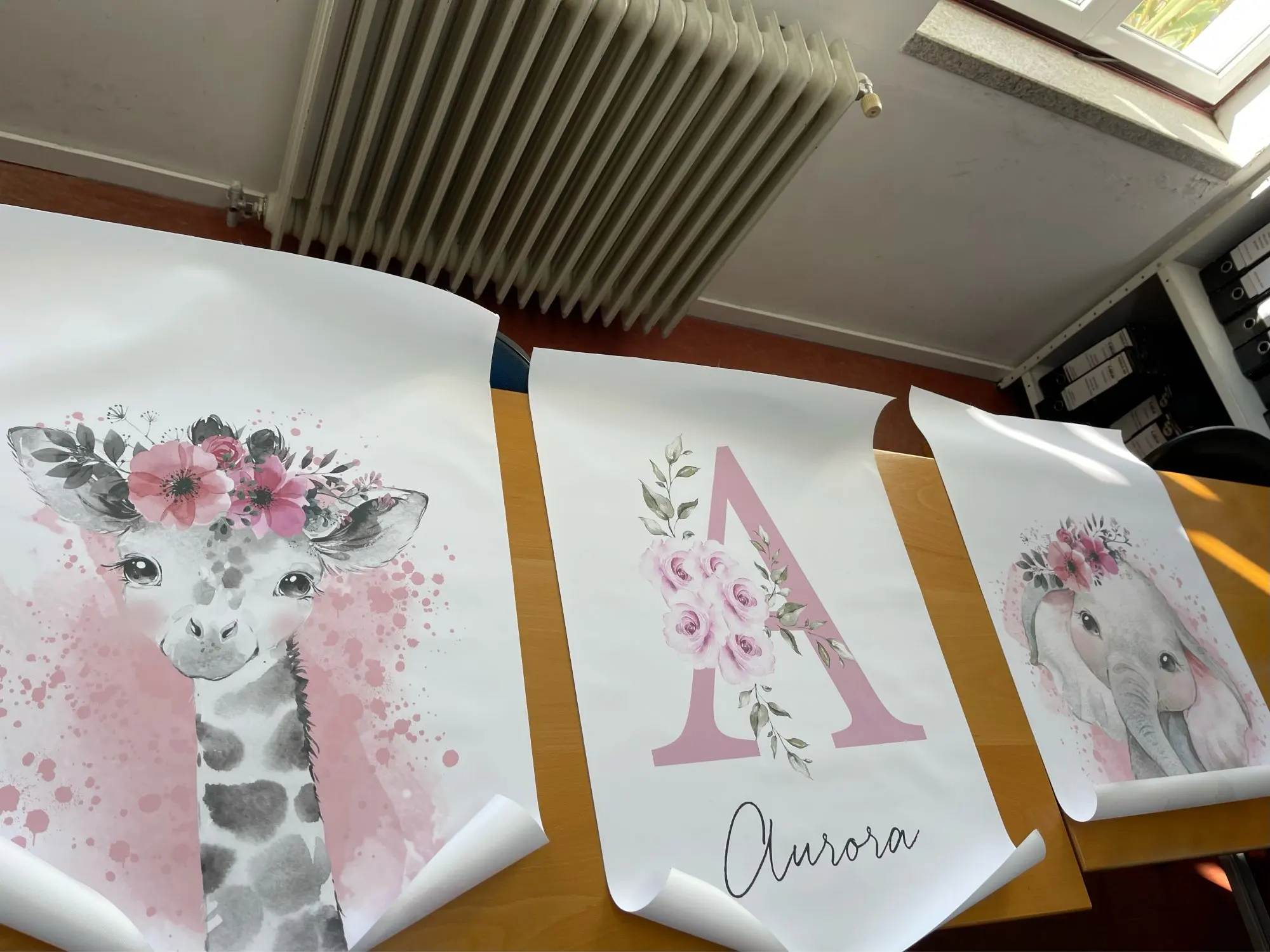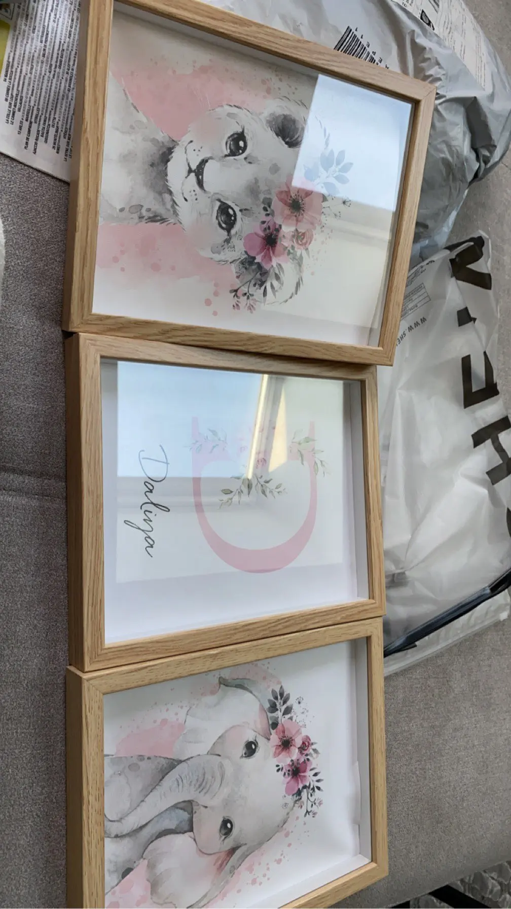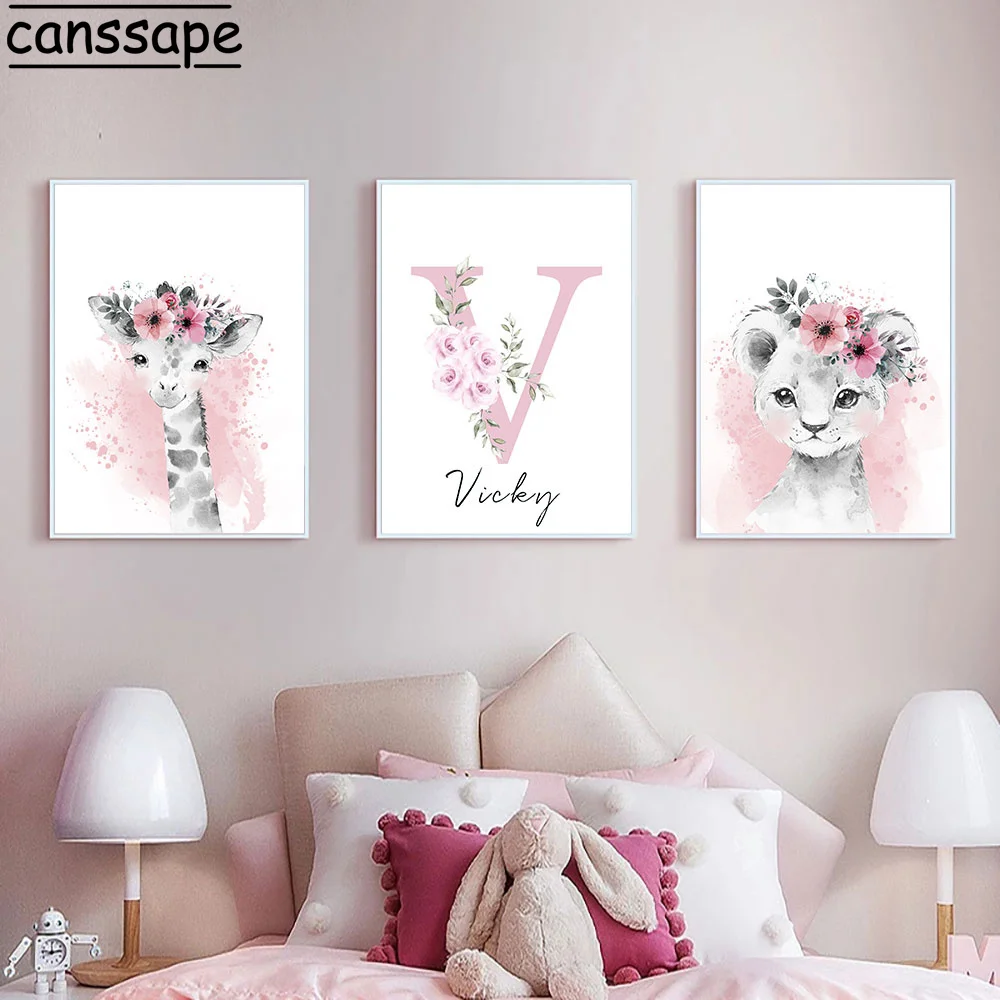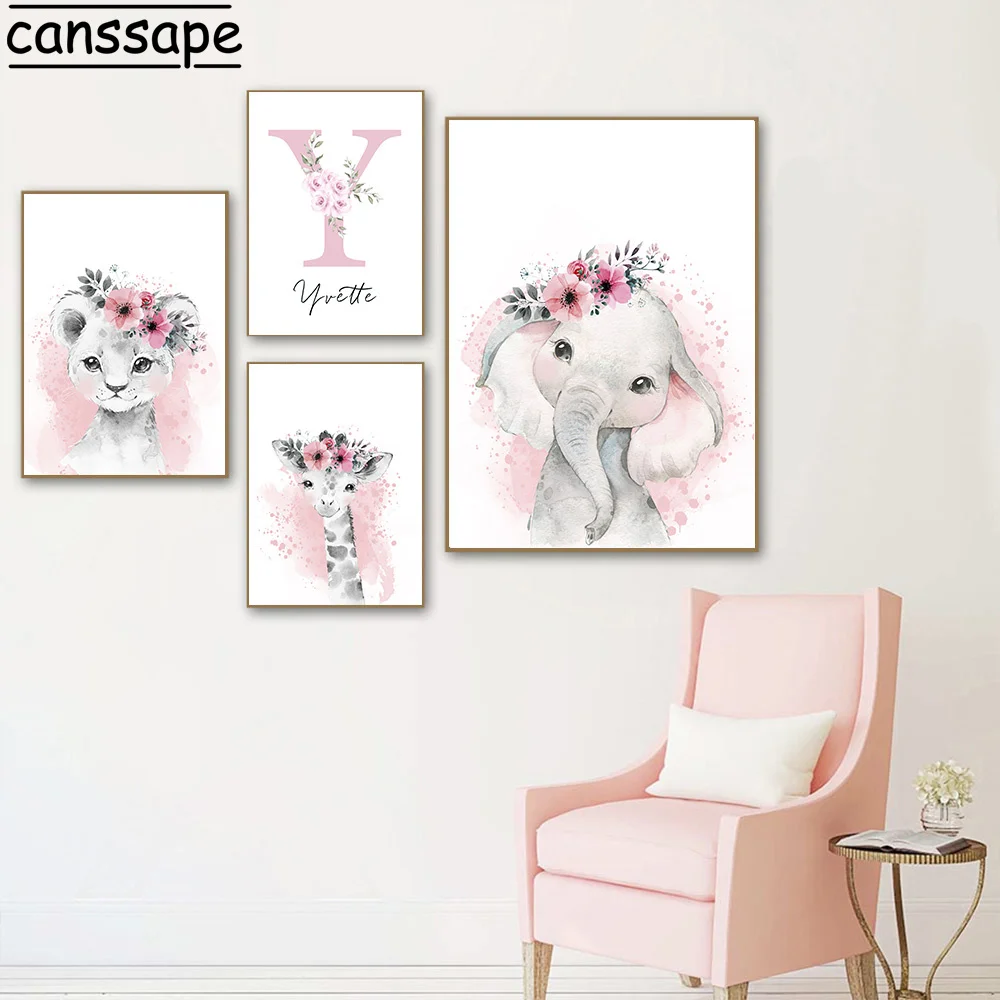 Постер для детской комнаты настенные плакаты с именем на заказ, жираф, слон, искусство, живопись, розовая буква, цветок, настенные картины в скандинавском стиле, украшение детской комнаты