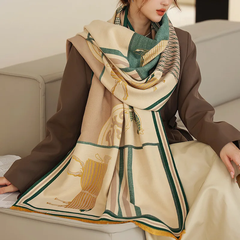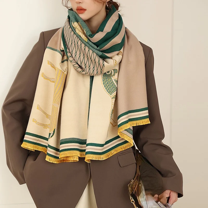 Шарф женский кашемировый, зимний, толстый, с принтом лошадей