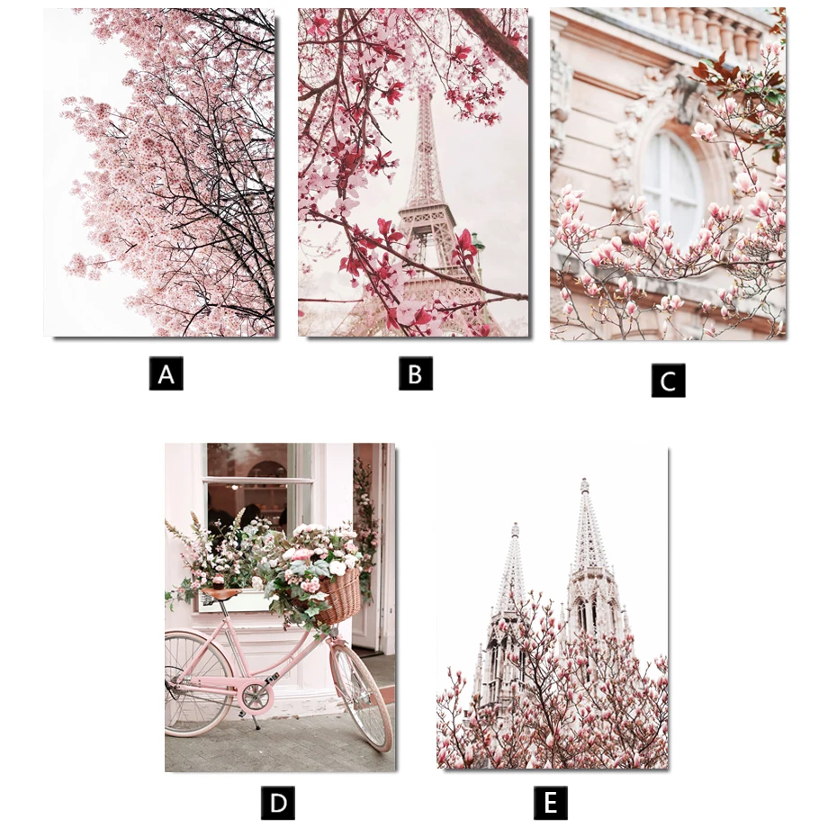 Розовый цветок дерево Ретро велосипед Париж, искусство на стену хол...