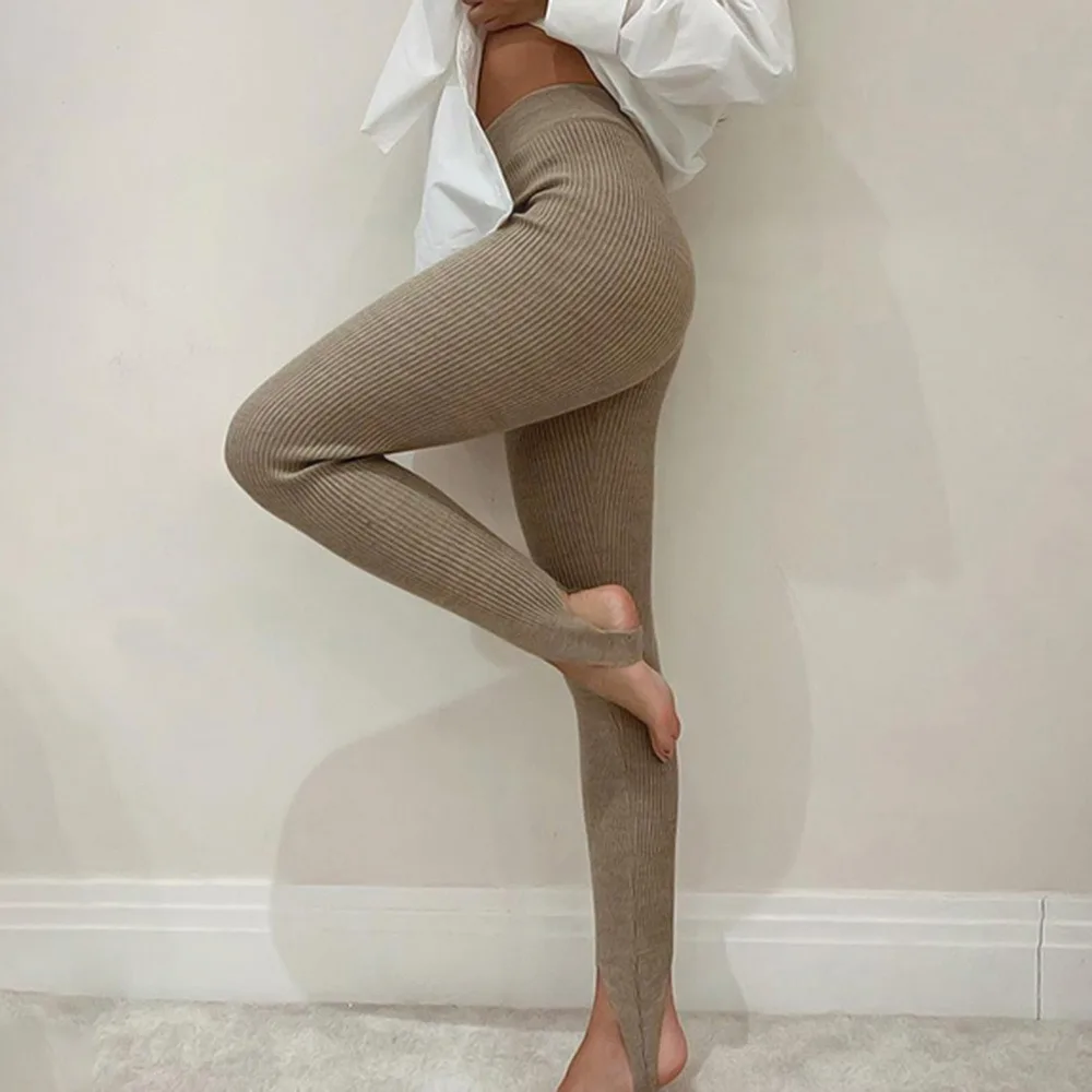Бежевые трикотажные леггинсы в рубчик 2021, женские хлопковые базовые брюки с высокой талией для фитнеса, повседневные Весенние Новые Универсальные женские облегающие леггинсы