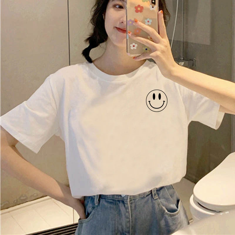 Женские футболки с принтом смайлика, женская футболка с мультяшным принтом, повседневный Топ 90-х, женская футболка с графическим принтом в стиле Харадзюку